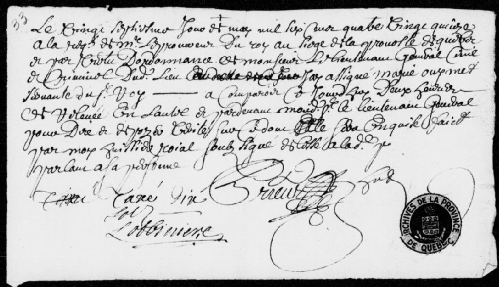 À la requête du procureur du Roi, assignation de Marie Ouimet, servante de Pierre Duroy et de sa femme, afin qu'elle comparaisse dans le cadre d'une enquête, 27 mai 1695, Archives nationales à Québec, Fonds Prévôté de Québec, (03Q,TL1,S11,SS2,D33).