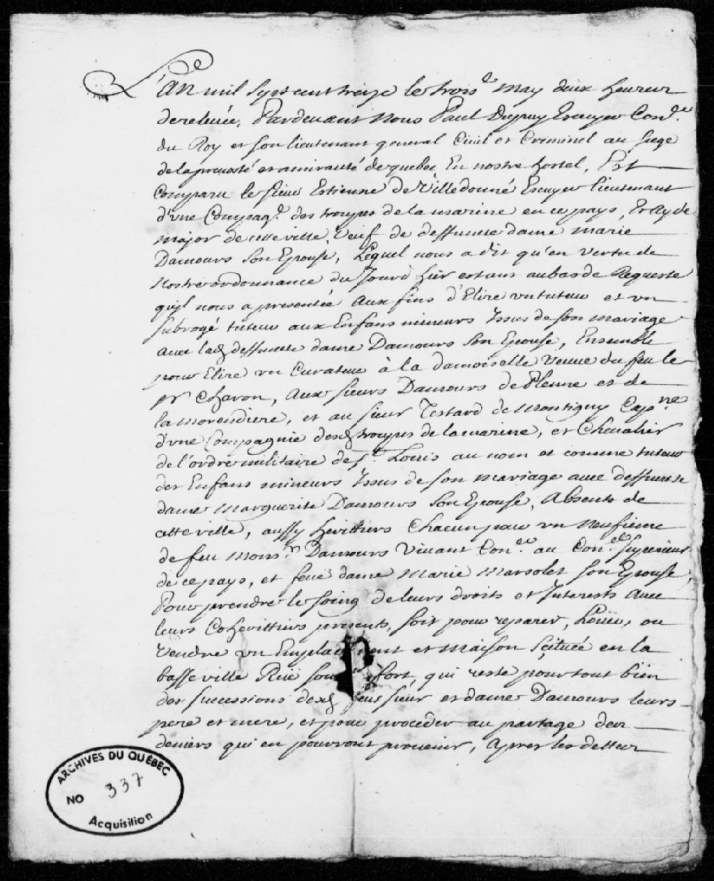 Procès-verbal de la nomination d'un tuteur pour les enfants mineurs d'Étienne de Villedonné et de Marie Damours, et d'un curateur pour les autres héritiers majeurs et absents de la succession Damours, ledit Étienne de Villedonné étant nommé tuteur et curateur, 3 mai 1713, Archives nationales à Québec, Fonds Prévôté de Québec, (03Q,TL1,S11,SS2,D337).