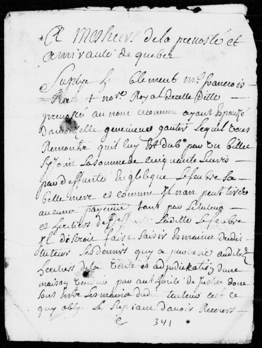 Requête de François Rageot, notaire royal en la Prévôté de Québec, au nom et comme ayant épousé Geneviève Gauthier, pour faire saisir François Gauthier, taillandier à Québec et tuteur des enfants mineurs de feue Angélique Lefebvre, belle-mère de Geneviève Gauthier, afin de récupérer les 50 livres portées par un billet signé par ladite défunte Lefebvre au requérant lors de la vente d'une maison, 17 novembre 1713 - 20 novembre 1713, Archives nationales à Québec, Fonds Prévôté de Québec, (03Q,TL1,S11,SS2,D341).
