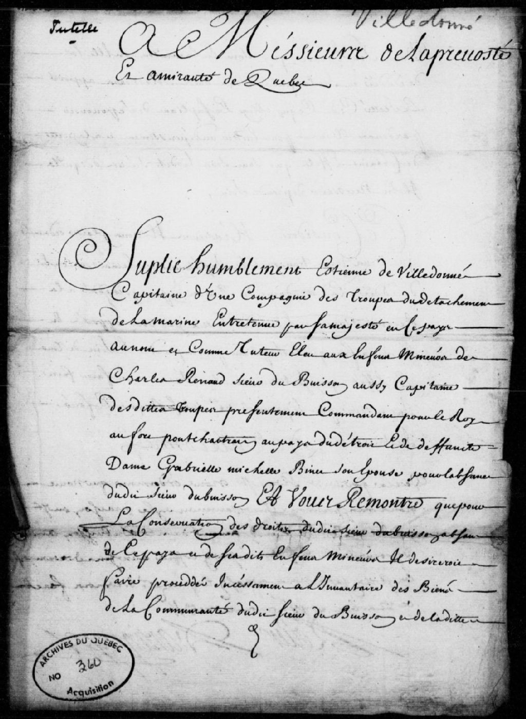 Requête d'Étienne de Villedonné, capitaine des troupes, au nom et comme tuteur des enfants mineurs de Charles Renaud, sieur Dubuisson, capitaine des troupes à Détroit, et de Gabrielle-Michelle Binet, son épouse décédée, afin que les scellés mis sur les biens de ladite épouse décédée soient levés, pour ainsi procéder incessamment à l'inventaire en faveur desdits enfants mineurs, 18 mars 1715, Archives nationales à Québec, Fonds Prévôté de Québec, (03Q,TL1,S11,SS2,D360).