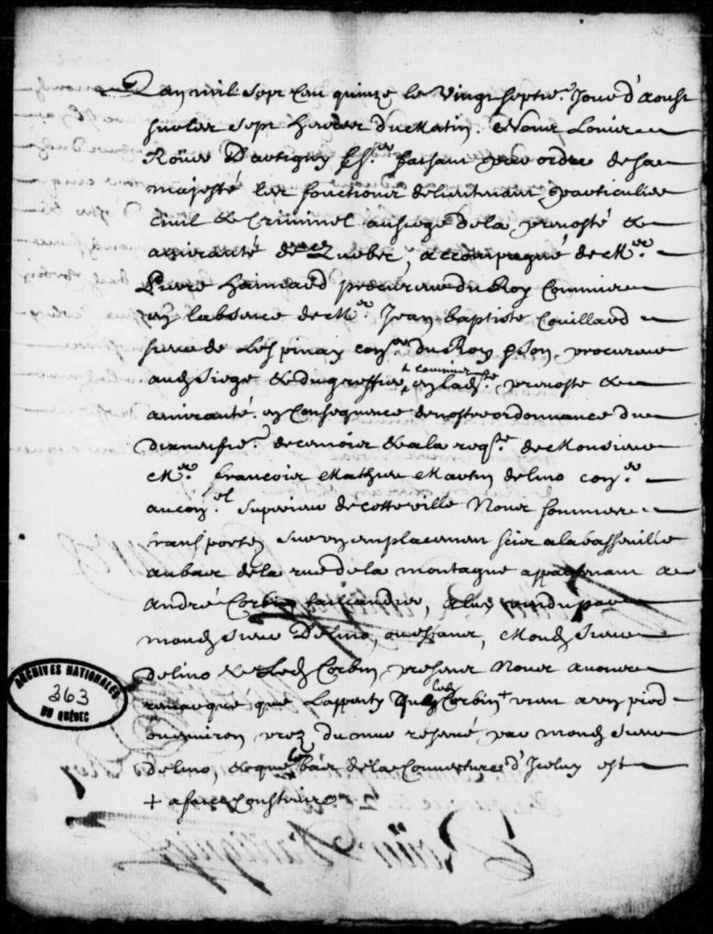 Procès-verbal de visite d'un appentis construit sur un emplacement sis en la Basse-Ville de Québec, au bas de la rue de la Montagne, appartenant à André Corbin, suivant l'instance intentée par François-Mathieu Martin, sieur de Lino, conseiller au Conseil supérieur de Québec, 27 août 1715, Archives nationales à Québec, Fonds Prévôté de Québec, (03Q,TL1,S11,SS2,D363).