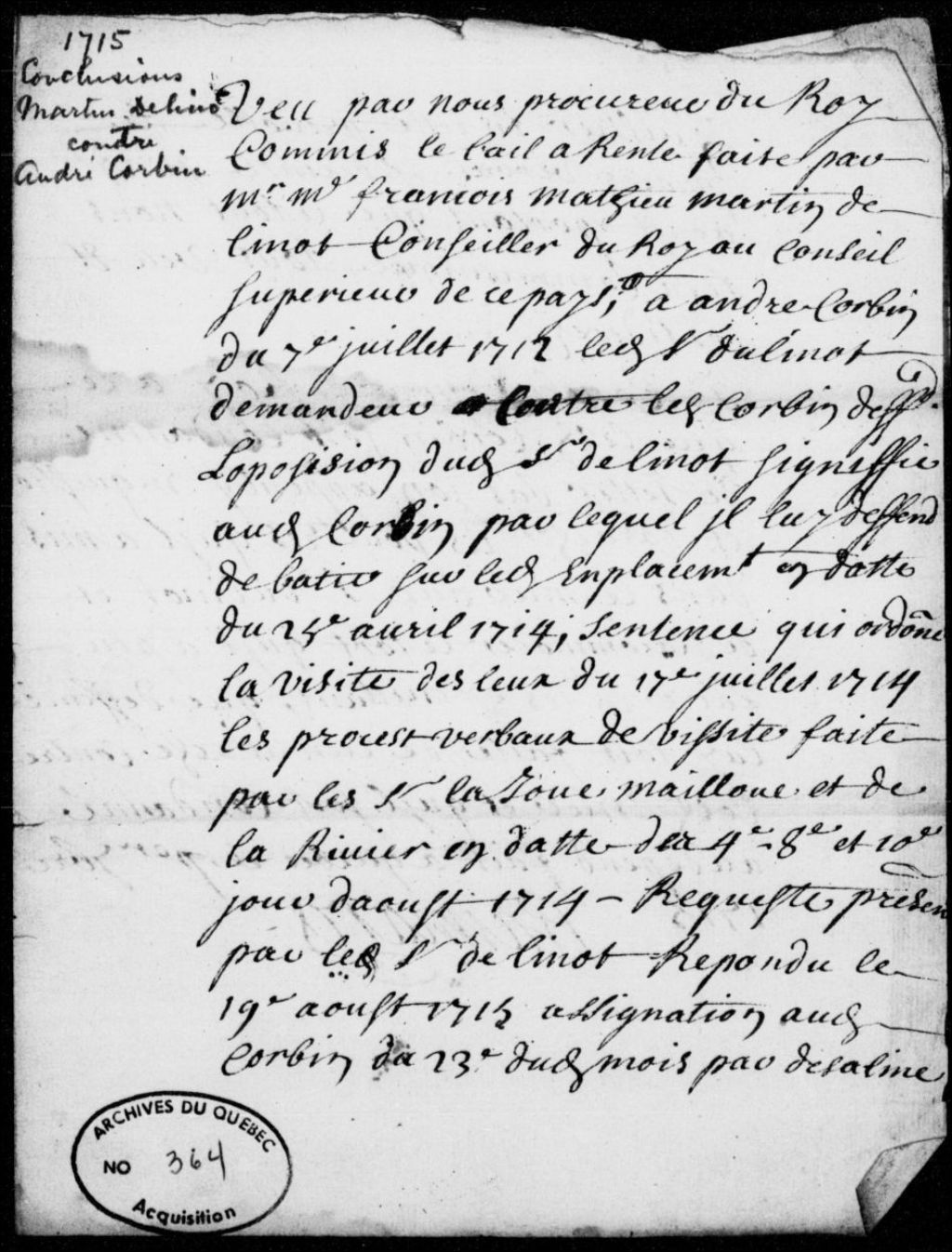 Sentence de Pierre Émard (Haimard) dans le procès de François-Mathieu Martin, sieur de Lino, conseiller au Conseil supérieur de Québec, contre André Corbin, taillandier, condamnant ce dernier à jeter bas son appentis, 1er septembre 1715, Archives nationales à Québec, Fonds Prévôté de Québec, (03Q,TL1,S11,SS2,D364).