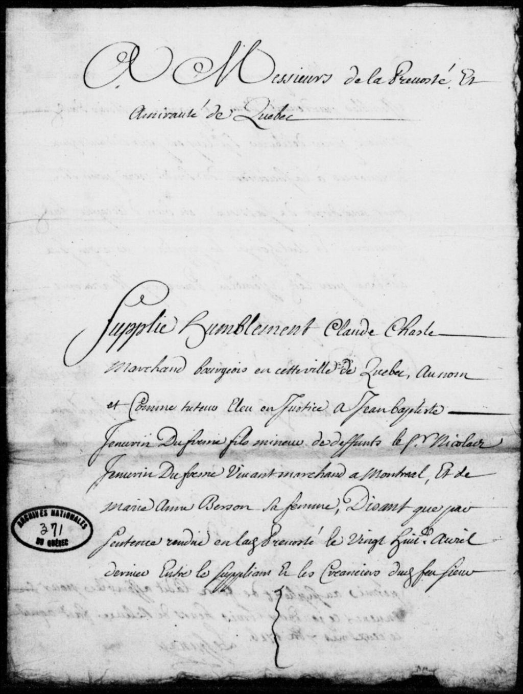 Requête de Claude Chasle, marchand bourgeois de Québec, afin que soient déterminés le lieu et la date à laquelle se tiendra une assemblée de parents et amis chargée de délibérer sur le bien-fondé, pour Jean-Baptiste Janvrin Dufresne, fils mineur des défunts Nicolas Janvrin dit Dufresne, de son vivant marchand de Montréal, et Marie-Anne Berson, d'accepter ou non la sucession de son père, 2 septembre 1716, Archives nationales à Québec, Fonds Prévôté de Québec, (03Q,TL1,S11,SS2,D371).