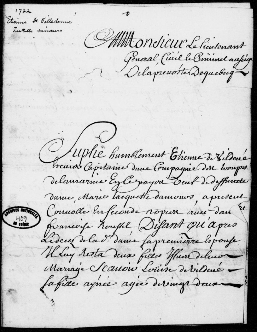 Requête d'Étienne de Villedonné, écuyer, capitaine d'une compagnie des troupes de la marine, veuf de feue dame Marie Damours, à présent époux en secondes noces de Marie-Françoise Roussel, afin que soient élus un tuteur et un subrogé tuteur pour sa fille aînée, Marie-Louise de Villedonné, 9 janvier 1722, Archives nationales à Québec, Fonds Prévôté de Québec, (03Q,TL1,S11,SS2,D409).