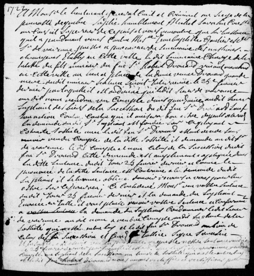 Requête de Michel Sarrazin, conseiller au Conseil supérieur de Québec, afin que Jean-Baptiste Gauthier, sieur de Varennes, procureur des messieurs du Séminaire de Québec chargés de la tutelle du fils mineur de feu Robert Drouard, marchand à Québec, lui rende compte de la succession dudit feu Robert Drouard, 11 juillet 1722, Archives nationales à Québec, Fonds Prévôté de Québec, (03Q,TL1,S11,SS2,D412).