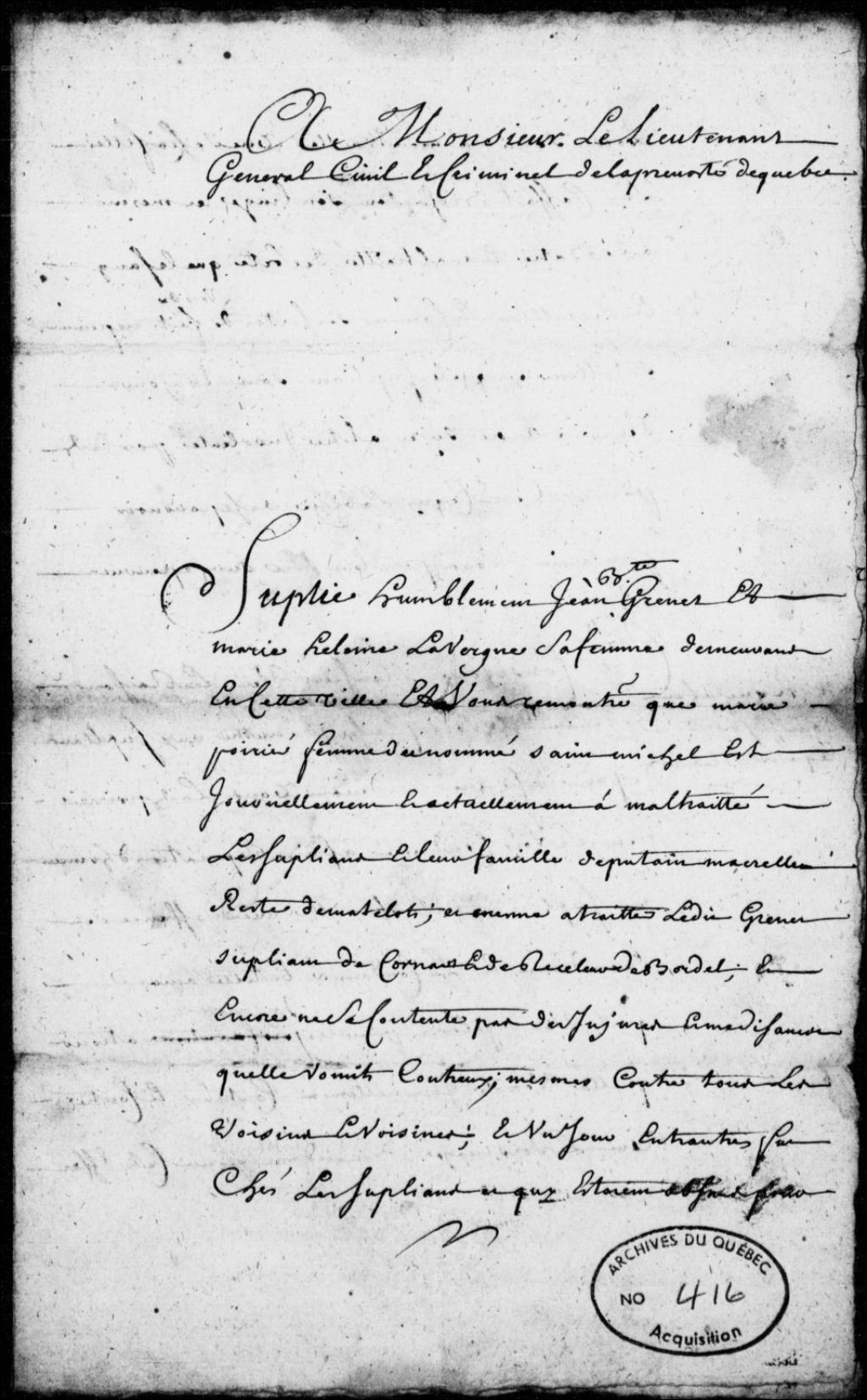 Requête de Jean-Baptiste Grenet et de sa femme Marie-Hélène Lavergne, demeurant à Québec, pour faire assigner Marie Poirier, femme d'un nommé Saint-Michel, afin qu'elle cesse ses injures et ses mauvais traitements contre les requérants et qu'elle paie une amende