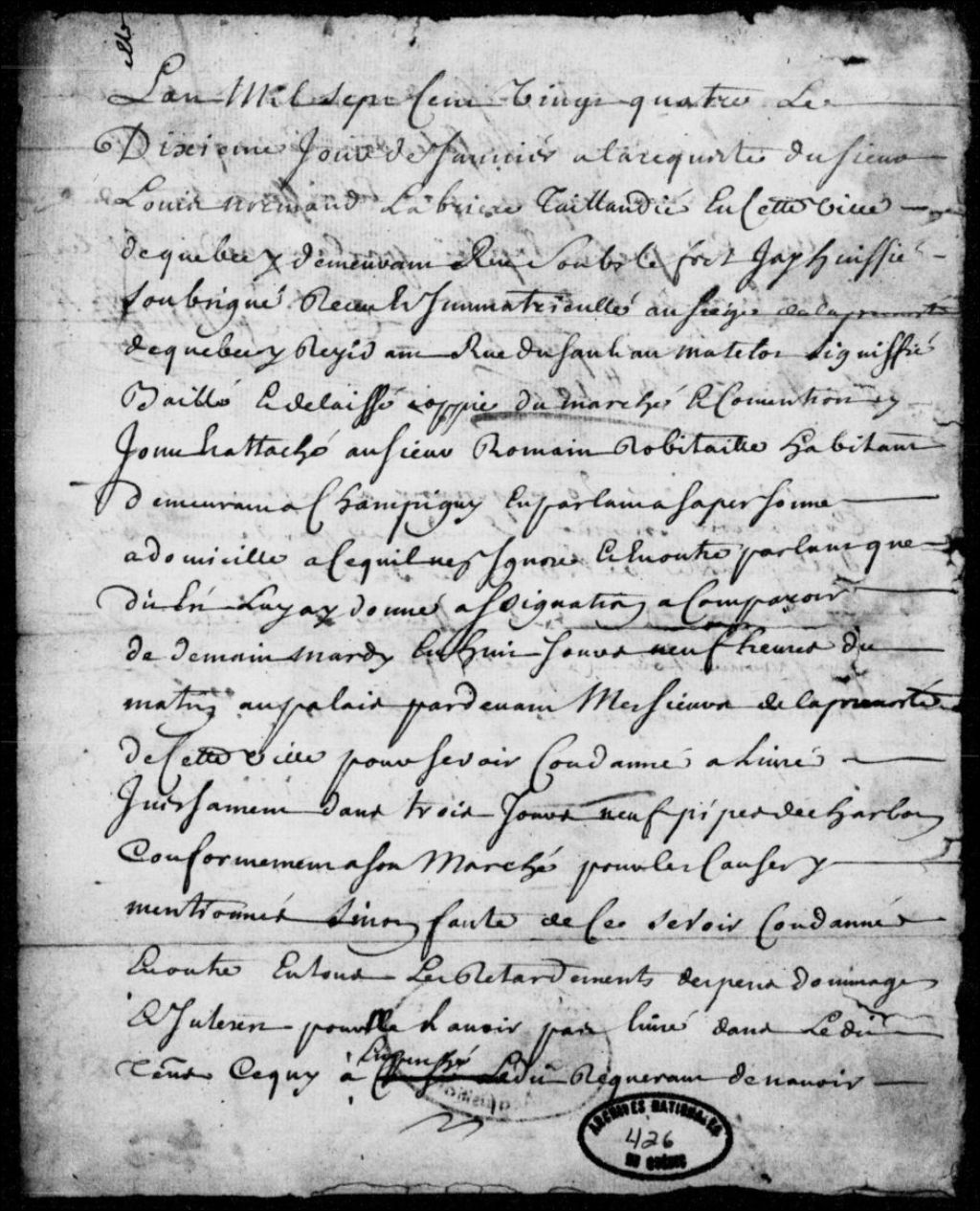 À la requête de Louis Normand dit LaBrière, taillandier à Québec, assignation de Romain Robitaille, habitant demeurant à Champigny, afin qu'il livre dans les trois jours neuf pipes de charbon, suivant un marché, sous peine de dommages et intérêts, et procuration donnée par Louis Normand à son épouse pour qu'elle agisse en son nom, 10 janvier 1724 - 27 janvier 1724, Archives nationales à Québec, Fonds Prévôté de Québec, (03Q,TL1,S11,SS2,D426).