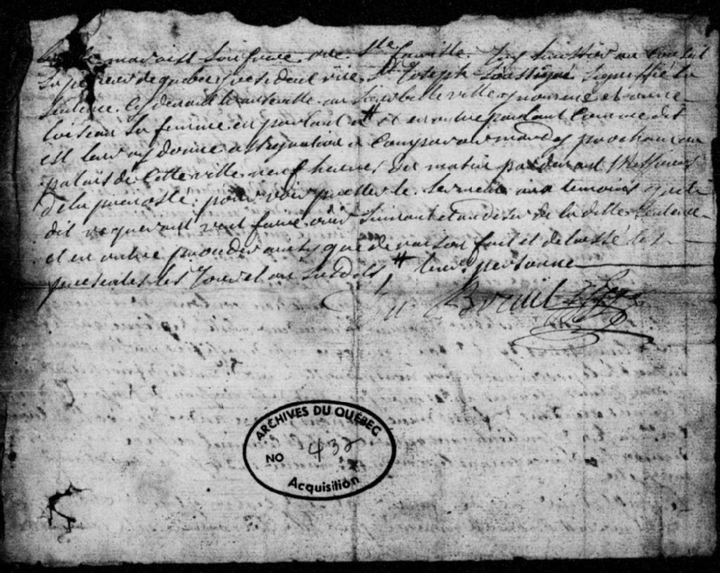- Ce dossier comprend une copie de la sentence rendue à l'encontre de Jean Boucher, le condamnant à payer 30 livres pour le foin qui lui fut livré par François Marois; un exploit d'assignation donné à Jean-Baptiste Marchessault dit Laramée, charretier de Québec, à Jean Rouillard, garçon apprenti du sieur Pierre Gratis, à Pierre Duval, menuisier de Québec, à Jacques Ménard, maître maçon de Québec, et à Paul de Rainville, habitant de la seigneurie de Beauport
