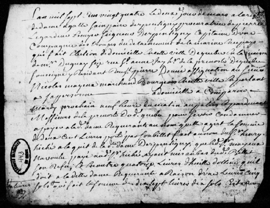 À la requête d'Agathe de Saint-Père, procuratrice de son mari Pierre Legardeur, sieur de Repentigny, capitaine d'une compagnie des troupes du détachement de la marine, assignation de Nicolas Mayeux (Mayeul), marchand à Québec, afin qu'il paie à la requérante 200 livres pour 14 livres d'huile, avec dépens, 2 mars 1724, Archives nationales à Québec, Fonds Prévôté de Québec, (03Q,TL1,S11,SS2,D443).