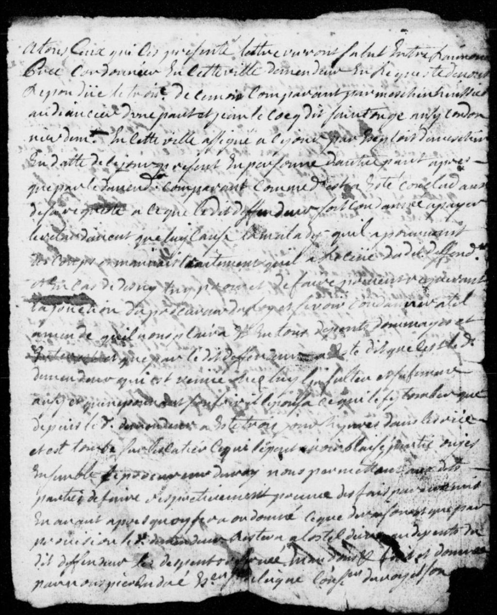 - Sentence de Pierre André, sieur de Leigne, lieutenant général de la Prévôté de Québec, dans l'instance opposant Jean-Baptiste Couillard, sieur de L'Espinay (Lespinay), conseiller du Roi, lieutenant particulier en la Prévôté de Québec et lieutenant général de l'Amirauté, veuf de feue Geneviève de Chavigny, à Joseph Amiot, seigneur de Vincelot, fils unique et héritier de ladite feue dame de Chavigny, ordonnant que sans égard à une donation verbale, les biens de Chavigny seront partagés en parts égales, faute de preuves