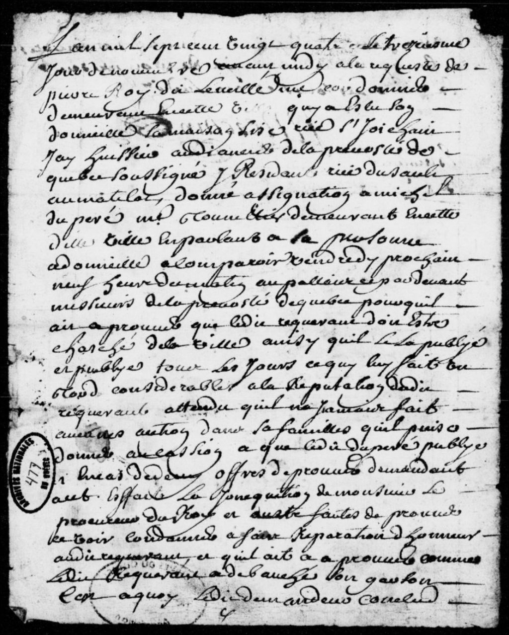 À la requête de Pierre Roy dit Léveillé, assignation de Michel Dupéré, maître tonnelier de Québec, afin qu'il vienne prouver pourquoi le requérant devrait être chassé de la ville, sinon il sera condamné à des réparations d'honneur, dommages et intérêts, avec dépens, 13 novembre 1724, Archives nationales à Québec, Fonds Prévôté de Québec, (03Q,TL1,S11,SS2,D477).