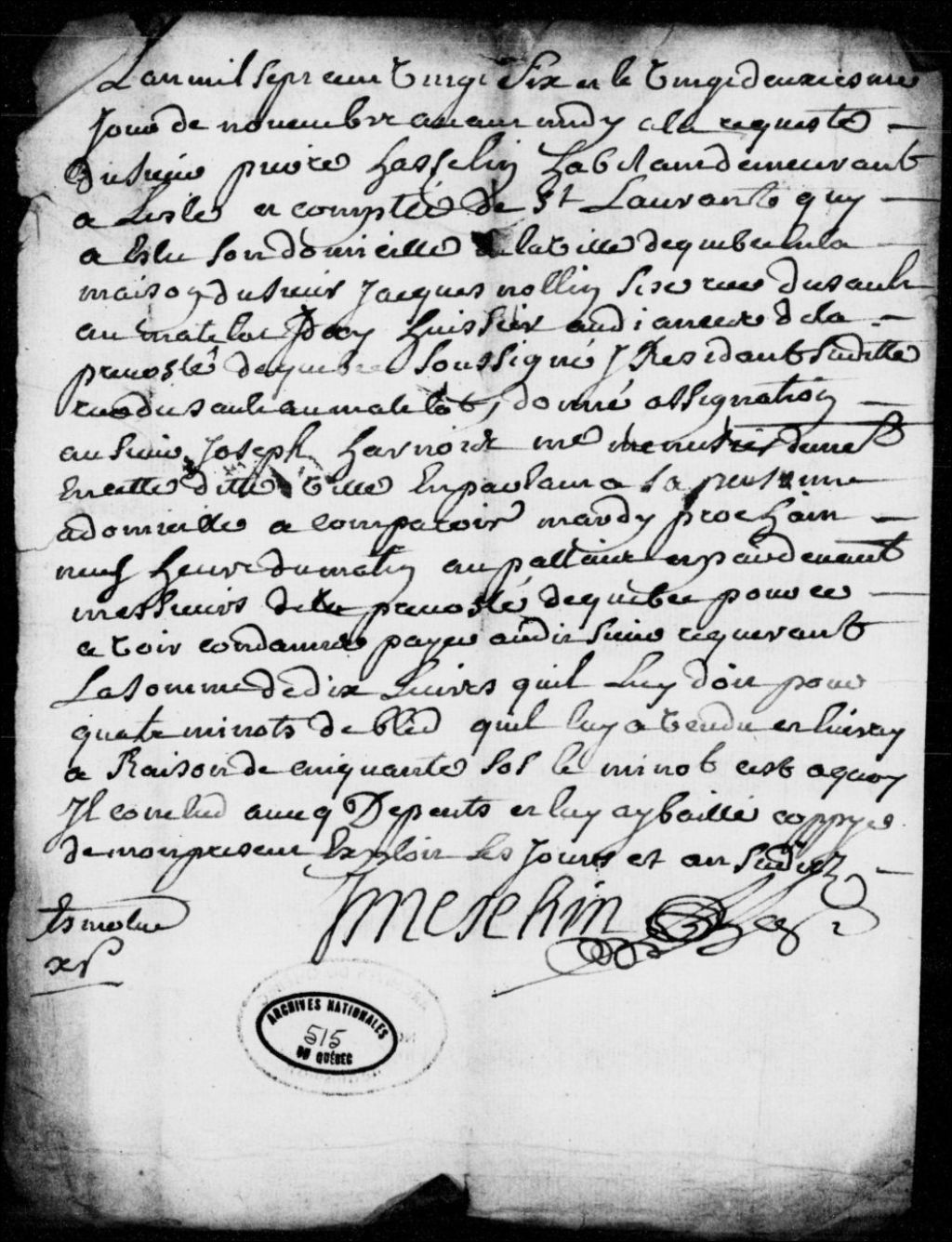 À la requête de Pierre Asselin, de Saint-Laurent de l'Île d'Orléans, assignation de Joseph Harnois, maître menuisier à Québec, afin qu'il paie au requérant 10 livres pour 4 minots de blé vendus et livrés, avec dépens, 22 novembre 1726, Archives nationales à Québec, Fonds Prévôté de Québec, (03Q,TL1,S11,SS2,D515).