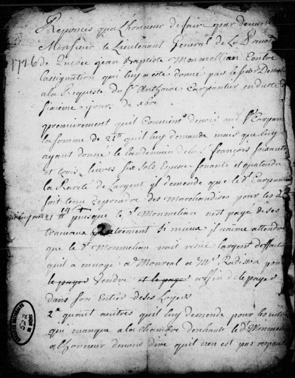 Réponse de Jean-Baptiste Monmellian à l'assignation de Dessalines (Desaline), demandée par Antoine Carpentier, suivie de l'attestation de location d'une maison située sur la rue Champlain au sieur Monmellian par ledit Antoine Carpentier, en date du 17 juillet 1726, 17 juillet 1726 - 6 décembre 1726, Archives nationales à Québec, Fonds Prévôté de Québec, (03Q,TL1,S11,SS2,D522).