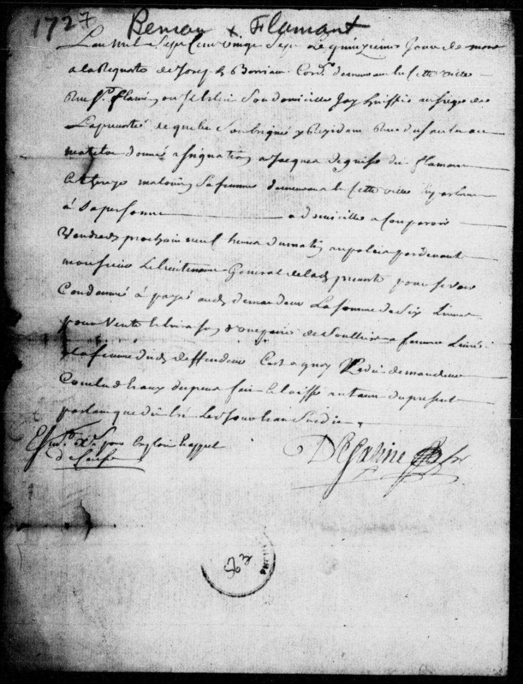 À la requête de Joseph Bériau, cordonnier à Québec, assignation de Jacques Deguise dit Flamand et de sa femme Thérèse Rinfret dit Malouin (Maloin), demeurant à Québec, afin qu'ils paient au requérant 6 livres pour la vente et la livraison d'une paire de souliers, avec dépens, 15 mars 1727, Archives nationales à Québec, Fonds Prévôté de Québec, (03Q,TL1,S11,SS2,D563).