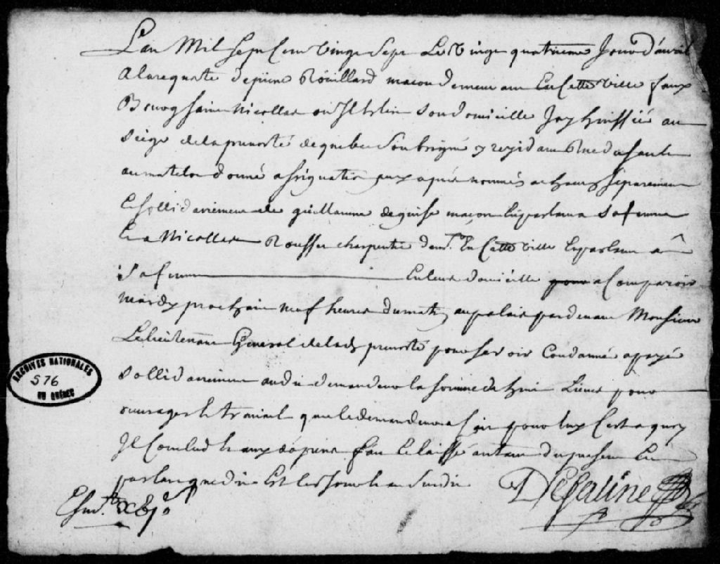 À la requête de Pierre Rouillard, maçon demeurant à Québec dans le faubourg Saint-Nicolas, assignation de Guillaume Deguise, maçon, et de Nicolas Rousset, charpentier de Québec, afin qu'ils paient solidairement au requérant 8 livres pour un ouvrage, avec dépens, 24 avril 1727, Archives nationales à Québec, Fonds Prévôté de Québec, (03Q,TL1,S11,SS2,D576).