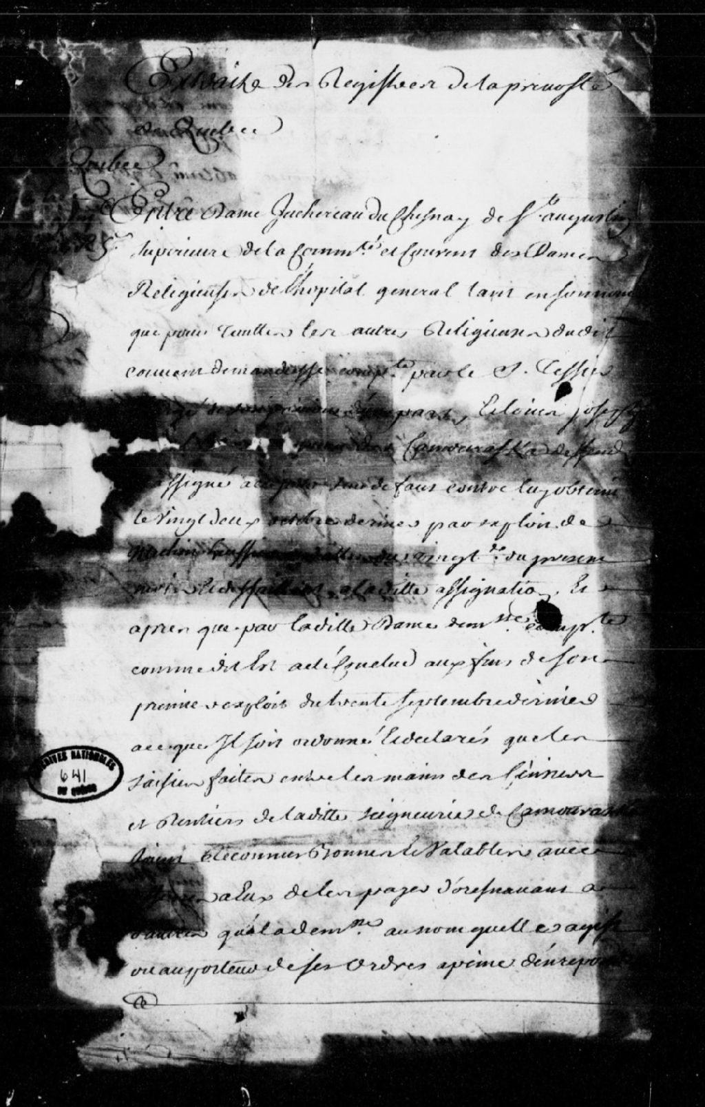 Sentence dans le procès de dame Juchereau Duchesnay de Saint-Augustin, supérieure de la communauté et du couvent des Dames Religieuses de l'Hôpital-Général, tant en son nom qu'au nom de toutes les autres religieuses dudit couvent, comparant par le sieur Tessier, procureur, contre Louis-Joseph Morel, seigneur de Kamouraska, assigné, défaillant et condamné à voir ses cens et rentes saisis pour payer les religieuses de l'Hôpital-Général, avec dépens, et signification de la sentence à Louis-Joseph Morel par l'entremise de Joseph Cognard, 25 novembre 1727 - 18 février 1728, Archives nationales à Québec, Fonds Prévôté de Québec, (03Q,TL1,S11,SS2,D641).