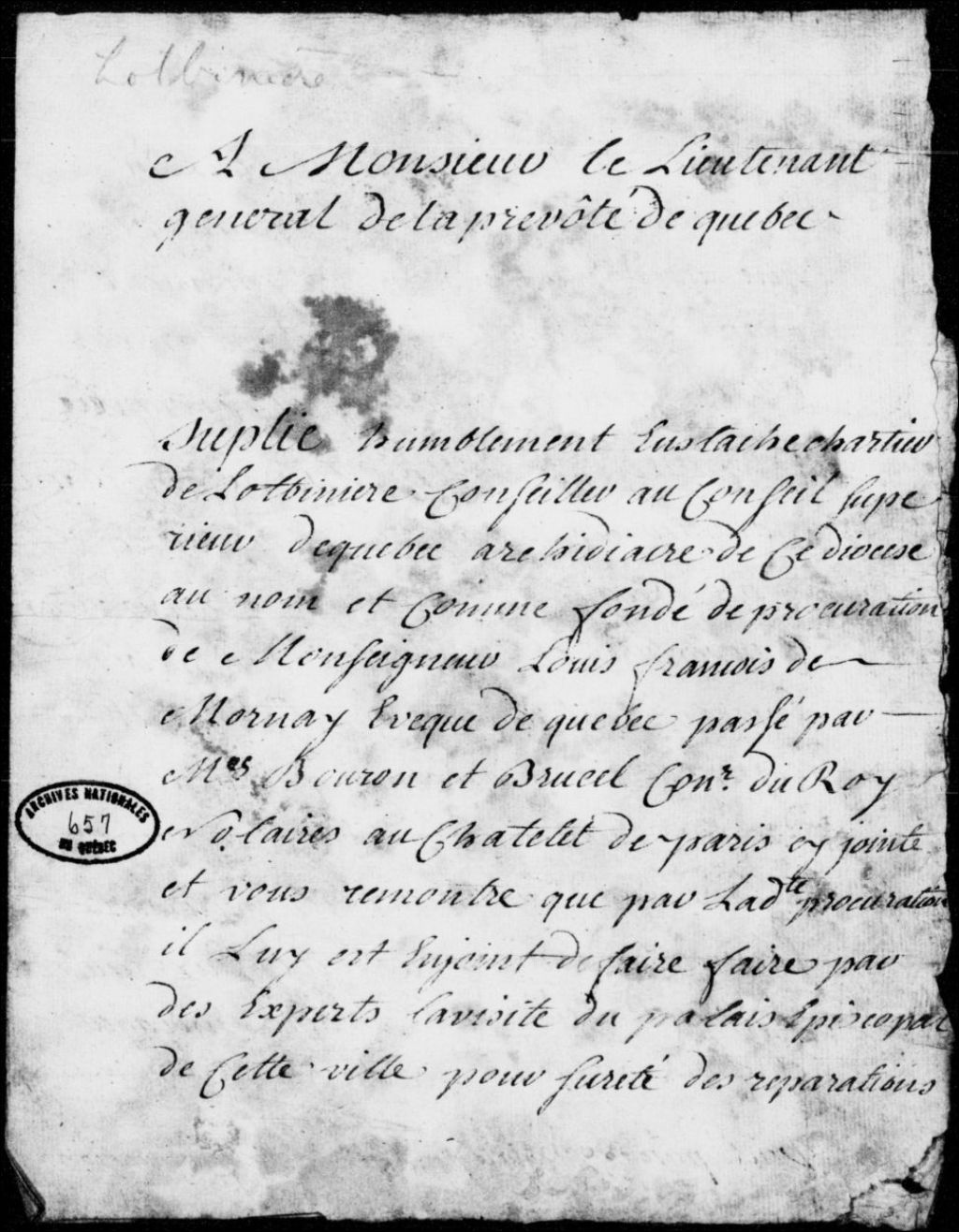 Instance d'Eustache Chartier de Lotbinière, archidiacre de Québec, muni d'une procuration de monseigneur Louis-François de Mornay (Mornet), évêque de Québec, afin d'obtenir des experts pour évaluer les réparations à faire au Palais épiscopal