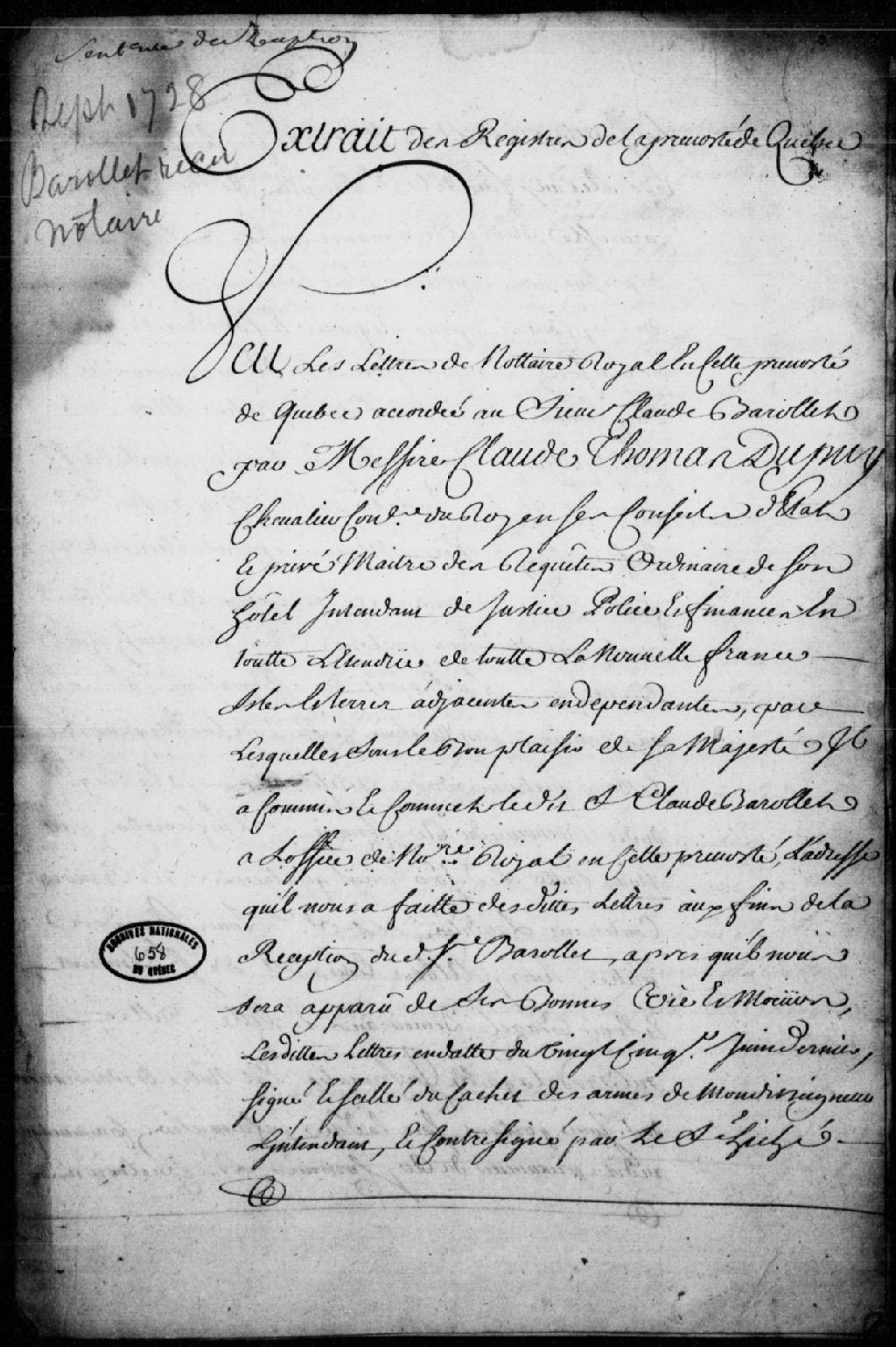 Ordonnance de Pierre André de Leigne à l'effet que les lettres de notaire royal accordées à Claude Barolet par Claude Thomas Dupuy (Dupuis), chevalier, conseiller du Roi en ses conseils d'État et privé, maître des requêtes ordinaires de son hôtel, intendant de justice, police et finances de toute la Nouvelle-France, seront insinuées au registre de la Prévôté, 28 septembre 1728, Archives nationales à Québec, Fonds Prévôté de Québec, (03Q,TL1,S11,SS2,D658).