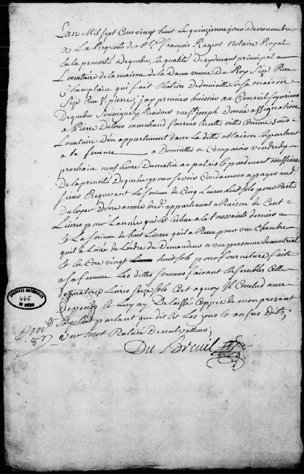 À la requête de François Rageot, notaire de la Prévôté de Québec, principal locataire de la maison de la dame veuve Duroy, assignation de Pierre Dutour, marchand fourreur, sous-locataire d'un appartement dans ladite maison, afin qu'il paie au requérant 14 livres et 16 sols pour son loyer et pour des marchandises, avec dépens, 15 novembre 1728, Archives nationales à Québec, Fonds Prévôté de Québec, (03Q,TL1,S11,SS2,D665).