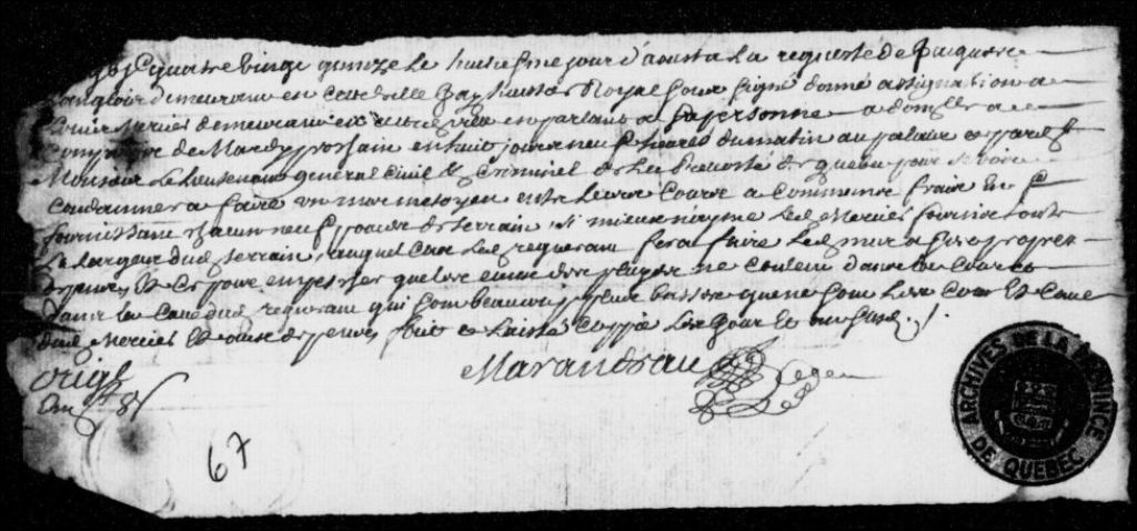 À la requête de Jacques Langlois, de Québec, assignation de Louis Mercier, de Québec, afin qu'il fournisse une part de son terrain pour l'érection d'un mur mitoyen entre leurs cours, car l'eau des pluies entre dans la cave plus basse du demandeur, 8 août 1695, Archives nationales à Québec, Fonds Prévôté de Québec, (03Q,TL1,S11,SS2,D67).