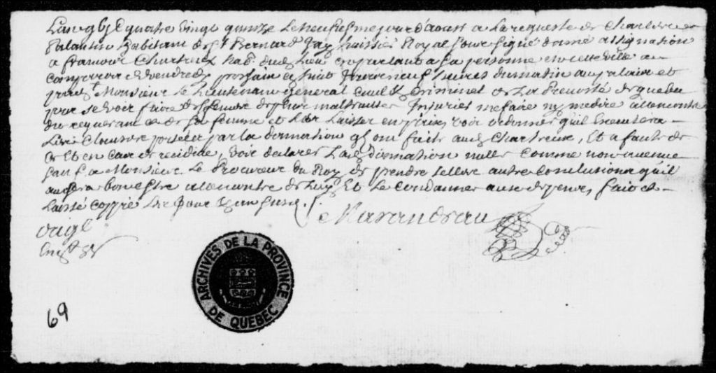 À la requête de Charles Palentin, habitant de Saint-Bernard, assignation de François Chartré, habitant du même lieu, afin qu'il cesse ses mauvais traitements, ses injures et ses médisances contre le requérant et qu'il observe les clauses d'une donation, sans quoi celle-ci sera annulée, 9 août 1695, Archives nationales à Québec, Fonds Prévôté de Québec, (03Q,TL1,S11,SS2,D69).