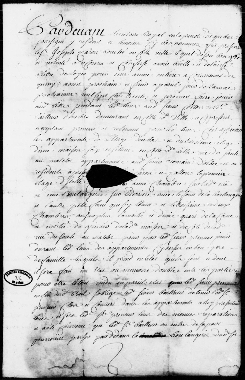 Copie d'un bail passé devant le notaire Pinguet, le 29 juillet, entre Joseph Caron, boucher à Québec, et Jean Coton, tailleur d'habits demeurant à Québec, suivie d'un exploit d'assignation donné à Joseph Caron, suivant la requête de Jean Coton, afin de l'obliger à respecter ledit bail, 29 juillet 1729 -18 août 1729, Archives nationales à Québec, Fonds Prévôté de Québec, (03Q,TL1,S11,SS2,D712).