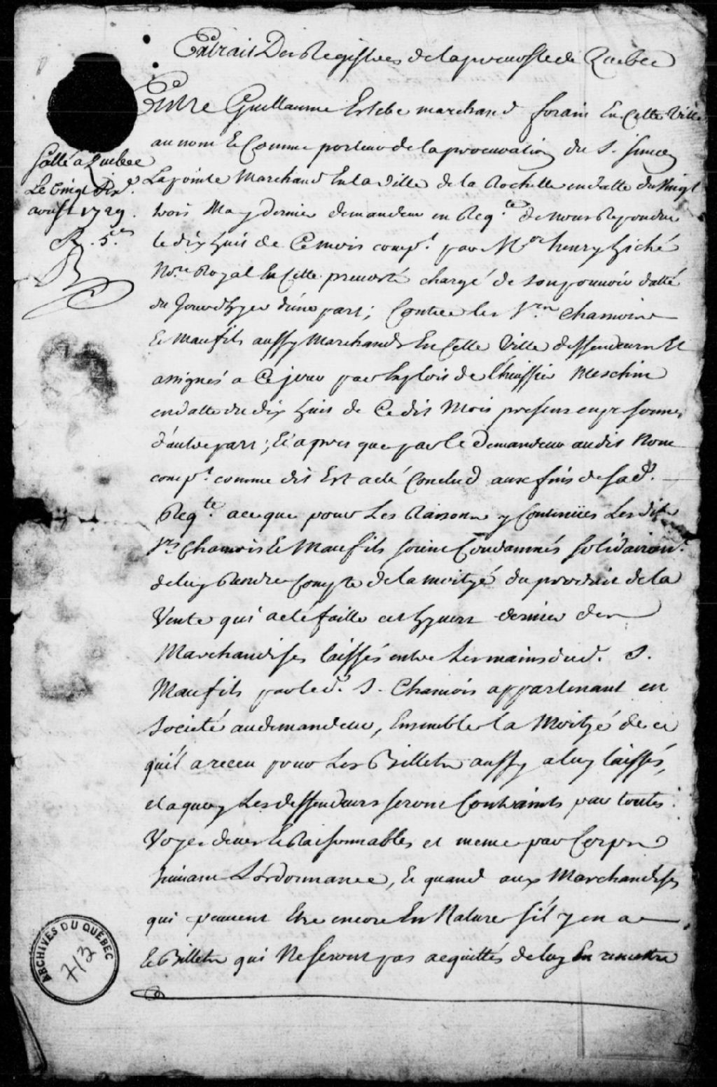 Sentence dans le procès de Guillaume Estèbe, marchand, procureur de Simon Lapointe, marchand de La Rochelle, comparant par Henri Hiché, contre les sieurs Chamois et Maufils, marchands de Québec, le sieur Maufils étant condamné à remettre au demandeur les trois quarts du produit de la vente des marchandises que lui a remises le sieur Chamois, et à lui rembourser certains billets, avec dépens, 23 août 1729, Archives nationales à Québec, Fonds Prévôté de Québec, (03Q,TL1,S11,SS2,D713).