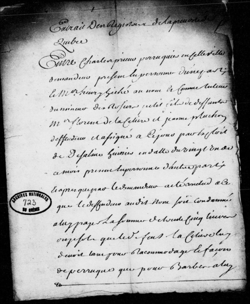 Sentence dans le procès de Charles Prieur, maître perruquier à Québec, contre Henri Hiché, tuteur du mineur Desrosiers (Desguerrois dit Desrosiers), petit-fils de maître Florent de La Cetière (Lacetière) et de Jeanne Pluchon, le demandeur réclamant 35 livres et 11 sols pour une perruque et une barbe achetées par ledit défunt de La Cetière, et le tribunal déclarant qu'il y a prescription dans la demande, et renvoyant l'action au demandeur, avec dépens, 22 novembre 1729, Archives nationales à Québec, Fonds Prévôté de Québec, (03Q,TL1,S11,SS2,D723).