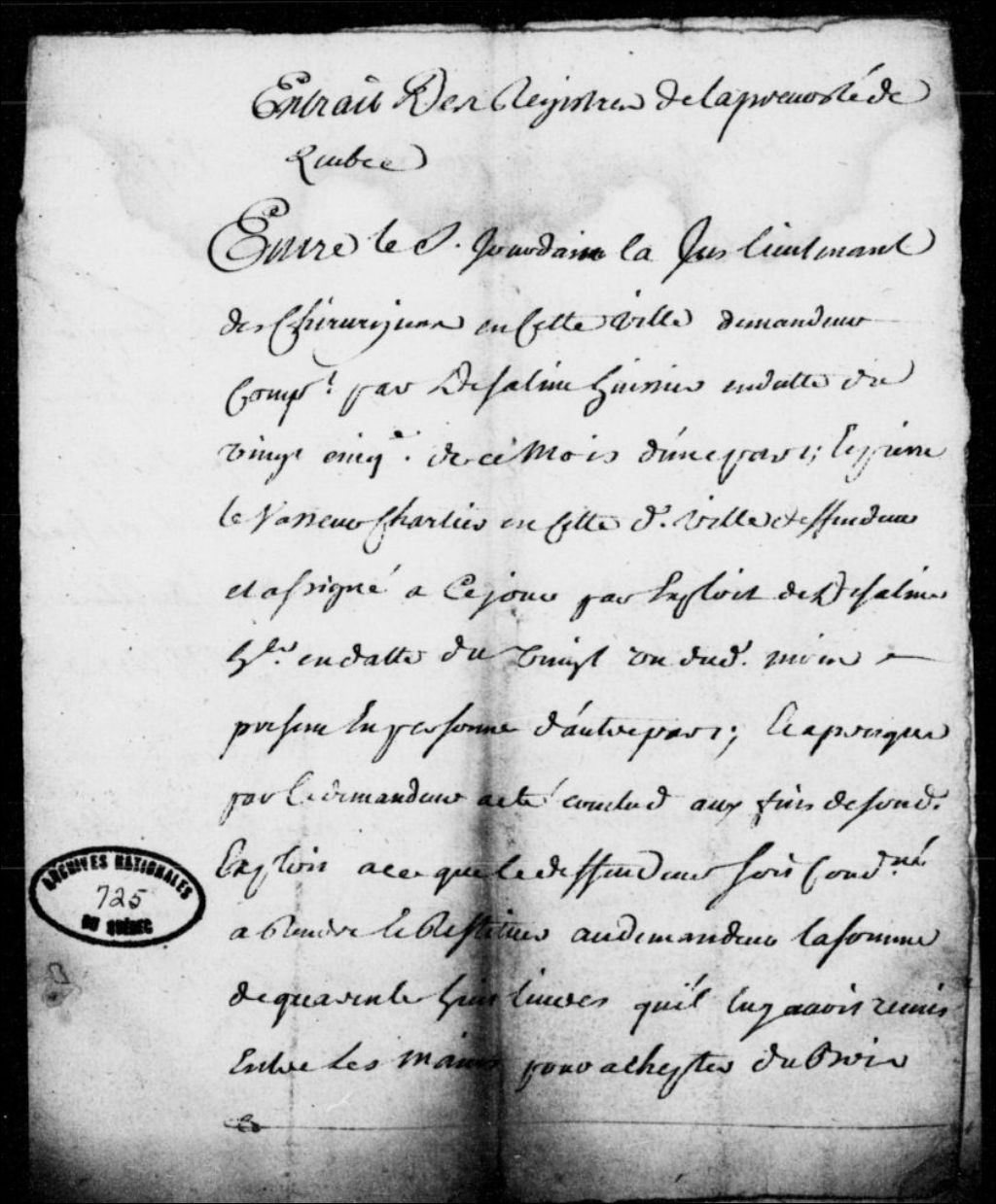 Procès de Jourdain Lajus, lieutenant chirurgien à Québec, contre Pierre Levasseur, charretier de Québec, le demandeur réclamant une somme de 48 livres remise à Pierre Levasseur afin qu'il achète du bois de chauffage pour son père, Noël Levasseur, et le défendeur niant les faits, 25 novembre 1729 - 2 décembre 1729, Archives nationales à Québec, Fonds Prévôté de Québec, (03Q,TL1,S11,SS2,D725).