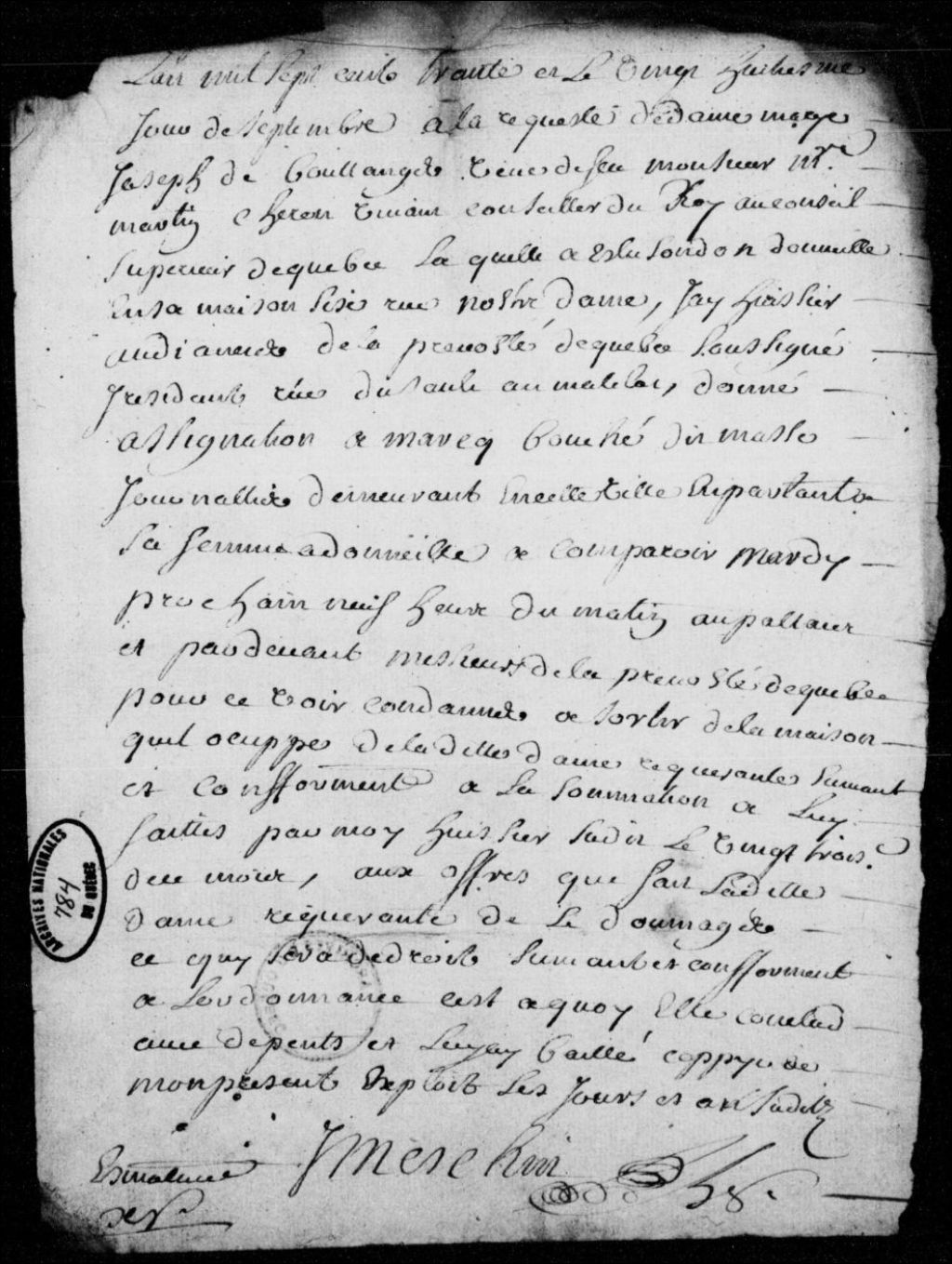 À la requête de Marie-Josèphe Boulanger, veuve de Martin Cheron, nouvelle assignation à Marc Boucher dit Masse, journalier, afin qu'il soit condamné à sortir de la maison qu'il occupe, avec offre de dédommagement de la part de la requérante, conformément à une ordonnance, et avec dépens