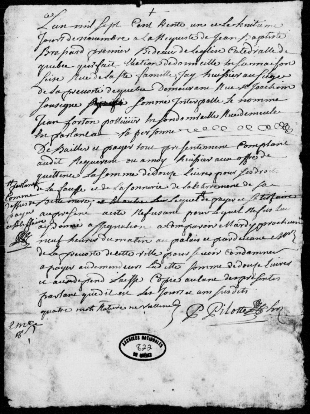 À la requête de Jean-Baptiste Brassard, premier bedeau à Notre-Dame de Québec, assignation de Jean Forton, policier de la rue Demeule (De Meulles), afin qu'il soit condamné à payer 12 livres au requérant pour les frais funéraires de sa belle-mère, 8 novembre 1731, Archives nationales à Québec, Fonds Prévôté de Québec, (03Q,TL1,S11,SS2,D822).