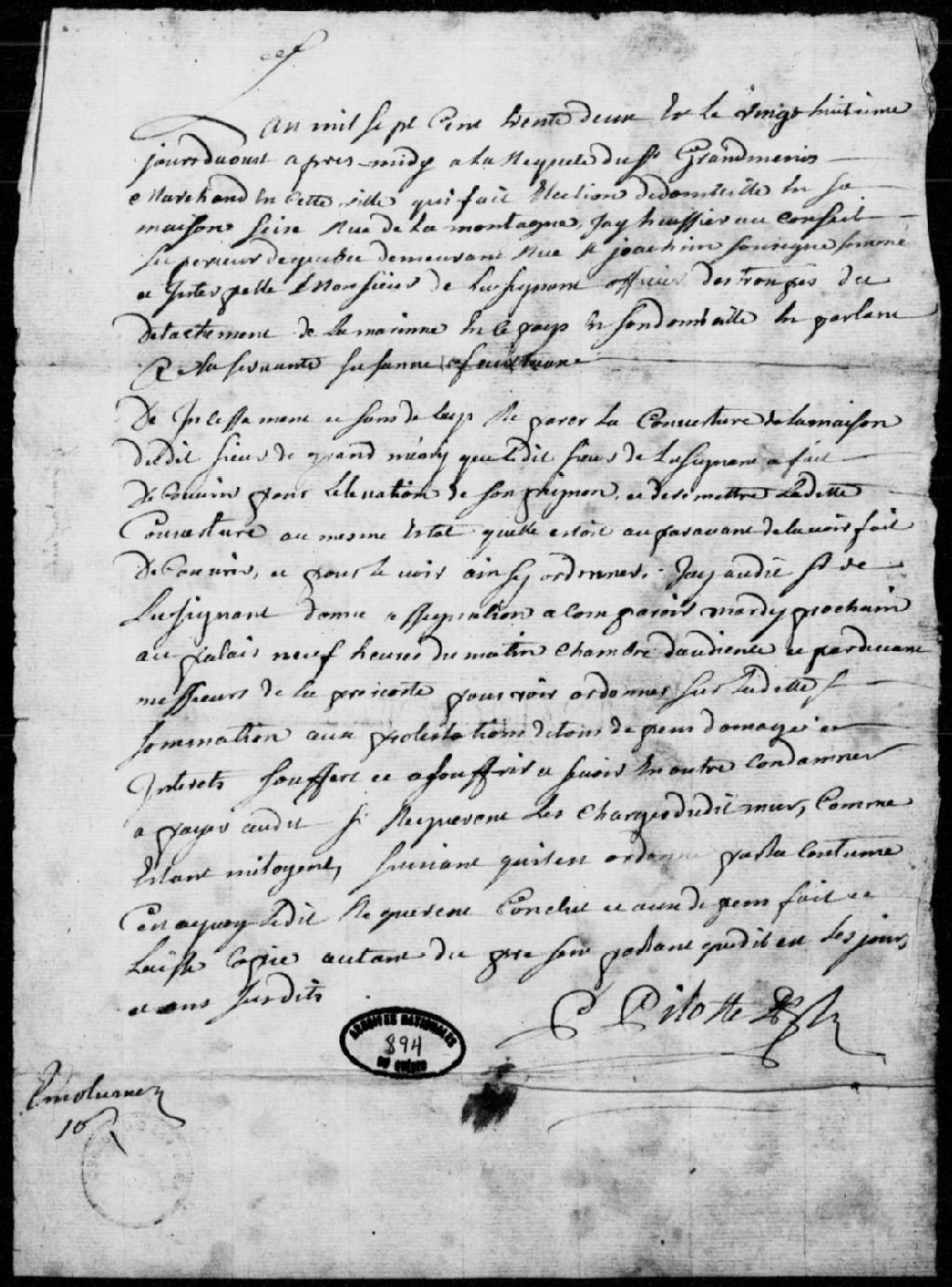 À la requête du sieur Grandmesnil, marchand de Québec, domicilié sur la rue de la Montagne, sommation au sieur de Lusignan, officier des troupes de la marine, pour réparer la couverture de la maison du requérant, détériorée à la suite de l'installation de son pignon, et assignation donnée audit sieur de Lusignan, afin de se voir condamner à ladite réparation avec dommages et intérêts soufferts et à souffrir, sans oublier les frais d'un mur mitoyen, avec dépens, 28 août 1732, Archives nationales à Québec, Fonds Prévôté de Québec, (03Q,TL1,S11,SS2,D894).