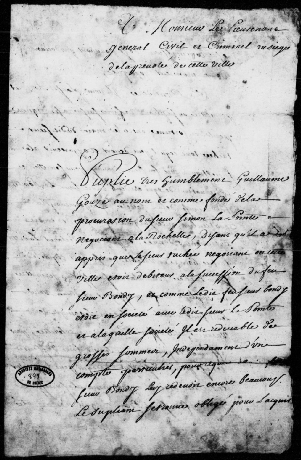 Requête de Guillaume Gouze, procureur de Simon Lapointe, négociant à La Rochelle, pour faire assigner Pascal Taché (Taschet), négociant de Québec, débiteur de la succession du sieur Bondy (Douaire), laquelle est débitrice dudit Lapointe, le requérant voulant faire saisir ledit Taché pour ce qu'il doit à la succession Bondy, permission de faire saisir, et deux significations de la requête audit Taché, 18 septembre 1732 - 20 septembre 1732, Archives nationales à Québec, Fonds Prévôté de Québec, (03Q,TL1,S11,SS2,D897).