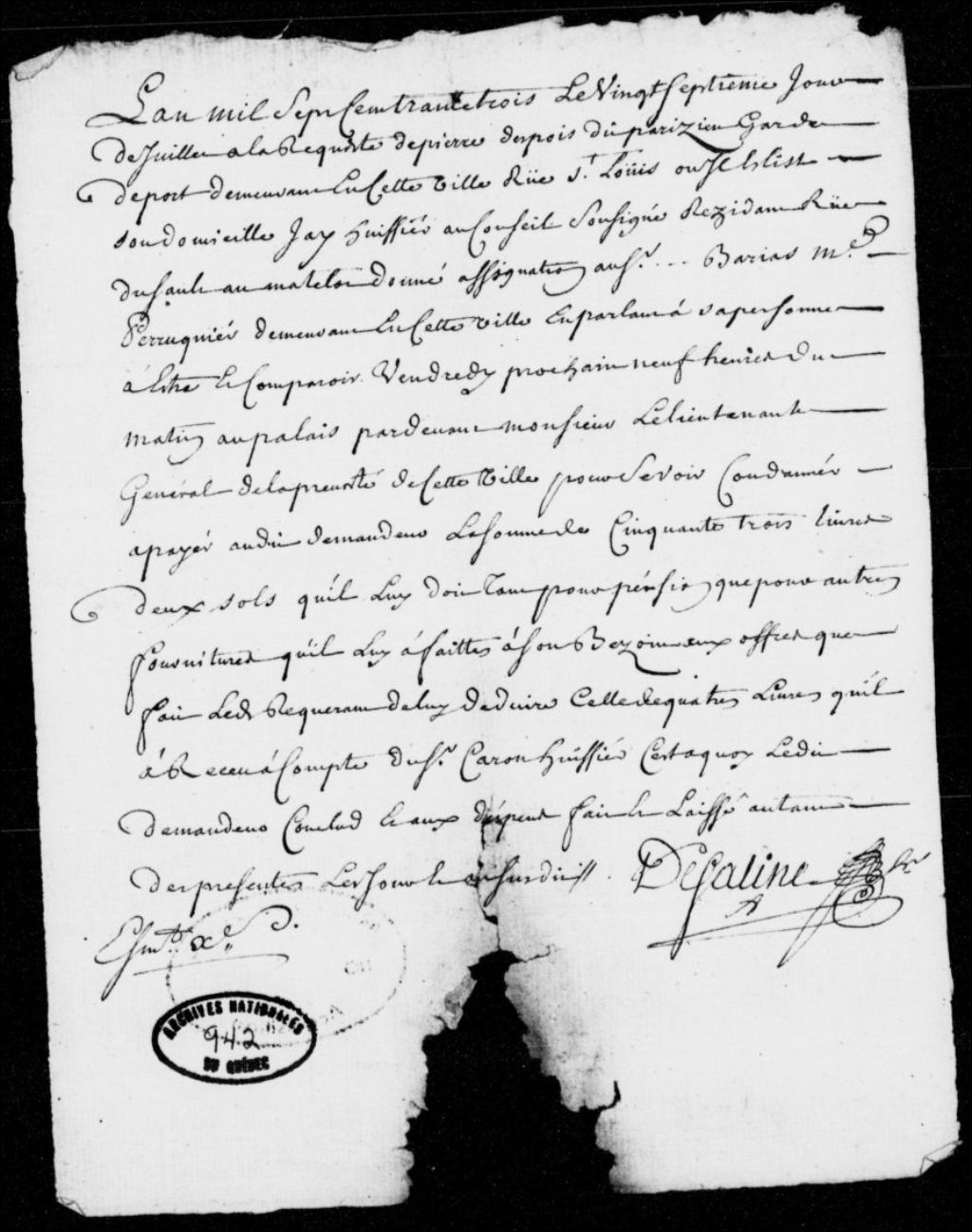 À la requête de Pierre Depoix dit Parisien, garde du port demeurant rue Saint-Louis à Québec, assignation du sieur Baria, maître perruquier à Québec, afin qu'il paie au requérant 53 livres et 2 sols, tant pour sa pension que pour des fournitures, en déduisant les 4 livres reçues en acompte de l'huissier Caron, avec dépens, 27 juillet 1733, Archives nationales à Québec, Fonds Prévôté de Québec, (03Q,TL1,S11,SS2,D942).