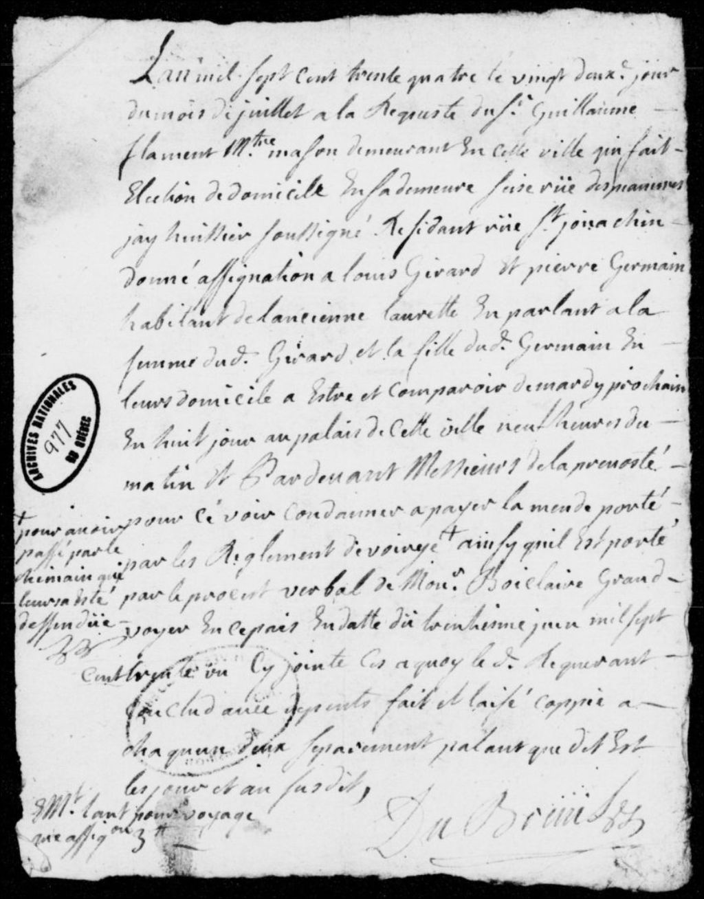 À la requête du sieur Guillaume Flamand, maître maçon demeurant à Québec, rue des Pauvres, assignation de Louis Girard et de Pierre Germain, habitants de l'Ancienne-Lorette, afin qu'ils soient condamnés à payer une amende en vertu des règlements de la voirie, pour être passés par un chemin défendu, laquelle infraction est décrite dans le procès-verbal de monsieur Boisclair, grand voyer, en date du 30 juin 1731, avec dépens, 22 juillet 1734, Archives nationales à Québec, Fonds Prévôté de Québec, (03Q,TL1,S11,SS2,D977).
