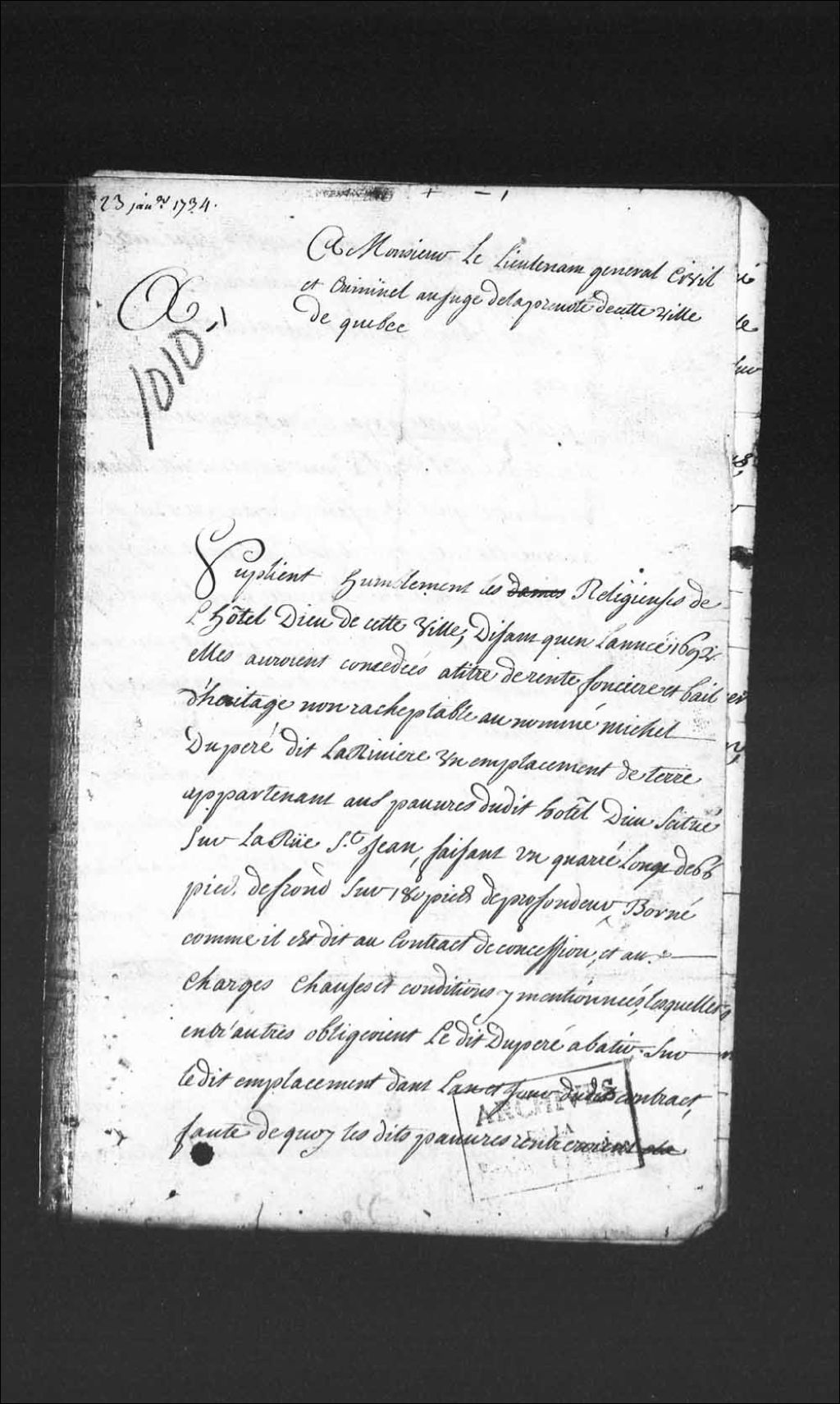 Instance entre Louis Dupéré, habitant de la paroisse de Charlesbourg, en sa qualité de fils aîné des enfants du premier lit de feu Michel Dupéré, tant pour lui que pour ses autres frères et soeurs, et le nommé Augustin Gilbert, forgeron de Québec, au nom et comme tuteur des enfants du second lit de Michel Dupéré; et les Religieuses de l'Hôtel-Dieu de Québec; au sujet d'un contrat de concession, fait par les susdites religieuses à Michel Dupéré dit Larivière, d'un emplacement de terre appartenant aux pauvres dudit Hôtel-Dieu