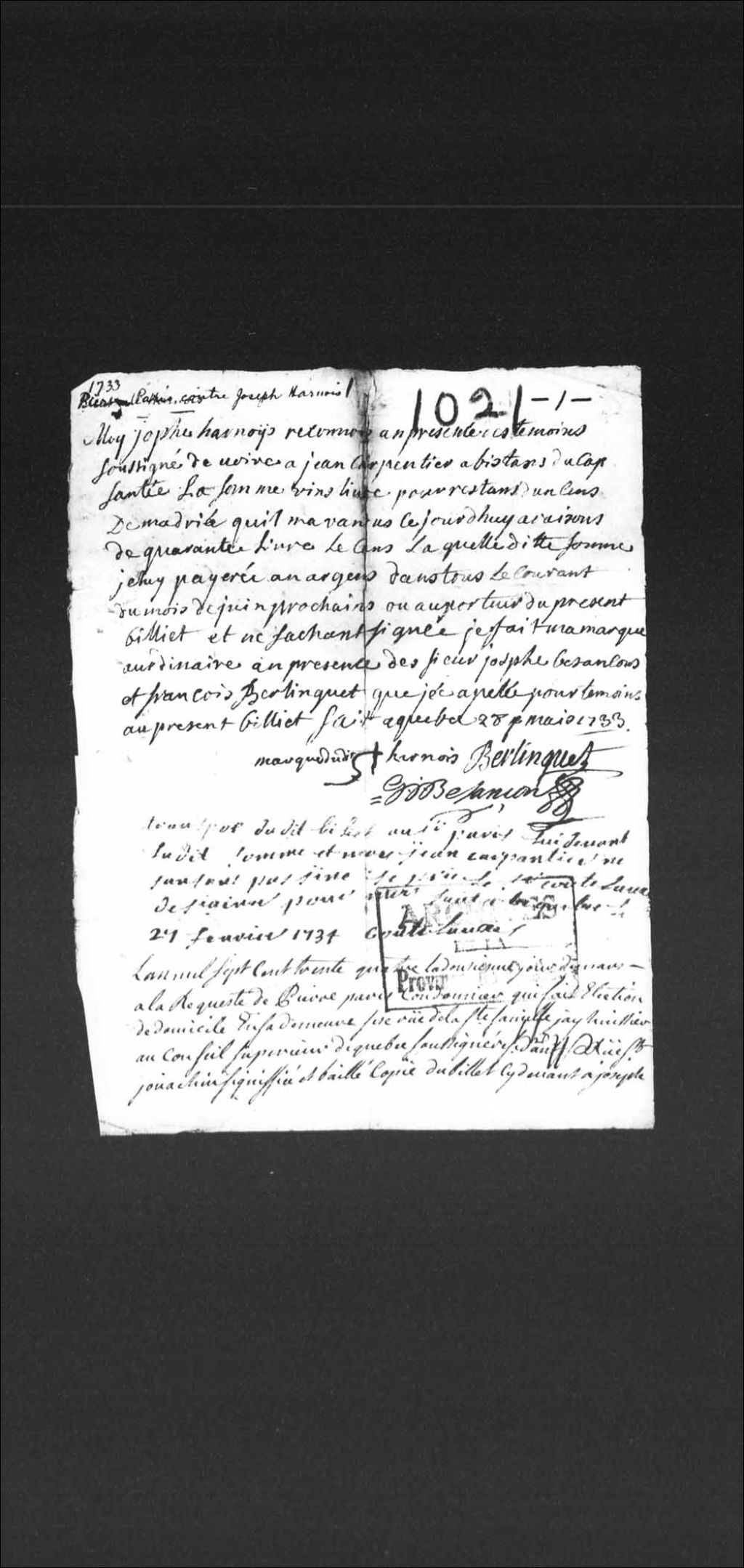 Billet promissoire de Joseph Harnois, au montant de 20 livres, pour une somme due à Jean Carpentier, habitant de Cap-Santé, pour l'achat de madriers; ledit billet présenté dans la cause opposant ledit Harnois à Pierre Paris, cordonnier; suivi d'un exploit de signification et d'assignation, 28 mai 1733 - 12 mars 1734, Archives nationales à Québec, Collection Pièces judiciaires et notariales, (03Q,TL5,D1021).