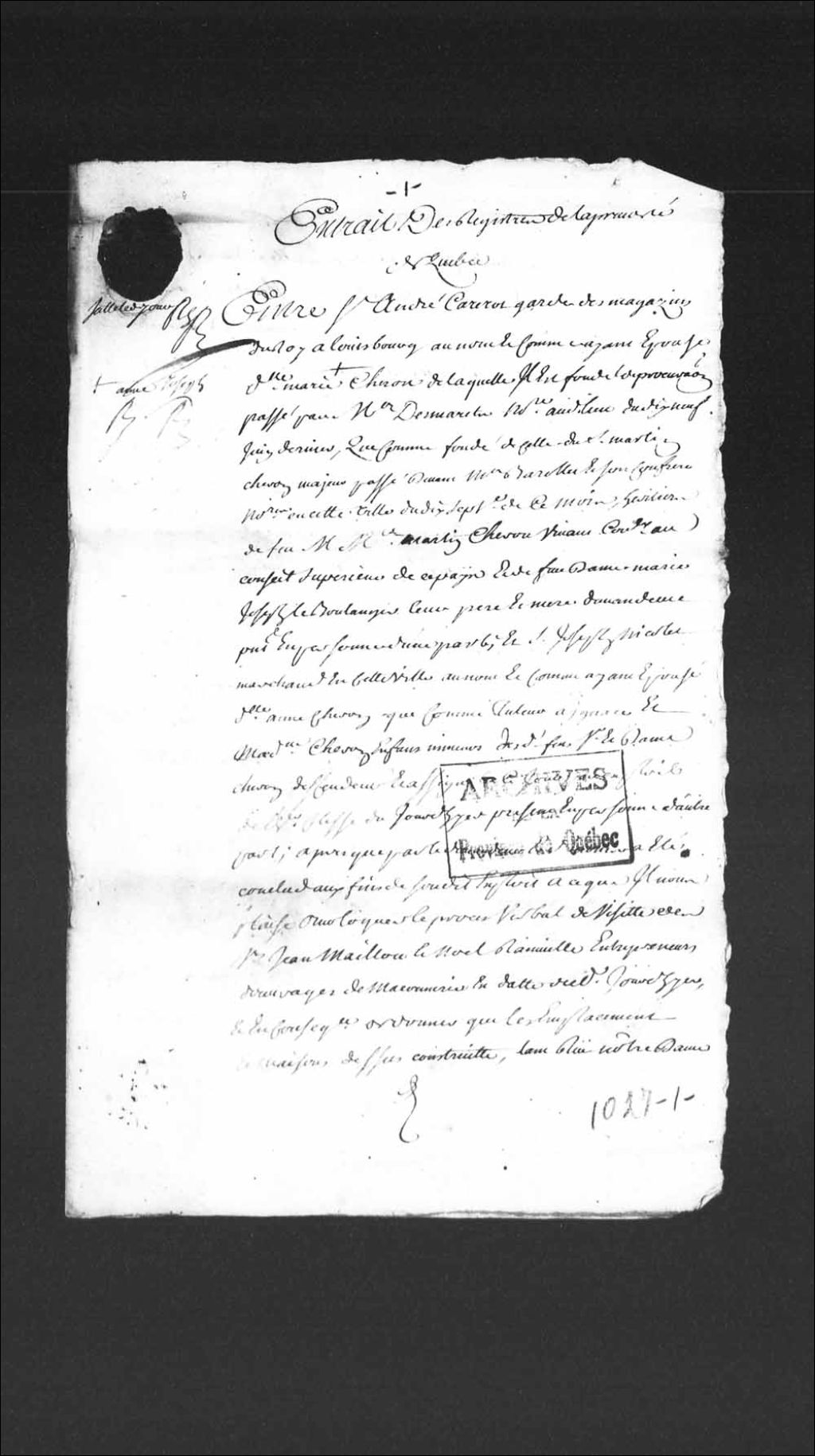 - Instance de Pierre-André Carrerot, garde des magasins du Roi à Louisbourg, au nom et comme ayant épousé Marie-Josèphe Cheron, et comme fondé de sa procuration et de celle de Martin Cheron fils, tous deux héritiers de feu Martin Cheron, vivant conseiller au Conseil supérieur de Québec, et de feue Marie-Josèphe Boulanger, leurs père et mère; contre Joseph Nicolet, marchand de Québec, au nom et comme ayant épousé Anne Cheron, et comme tuteur de Ignace et Madeleine Cheron, enfants mineurs des défunts Martin Cheron et Marie-Josèphe Boulanger; au sujet du partage et de la vente de maisons et terrains dépendants de la succession des susdits défunts Cheron et Boulanger