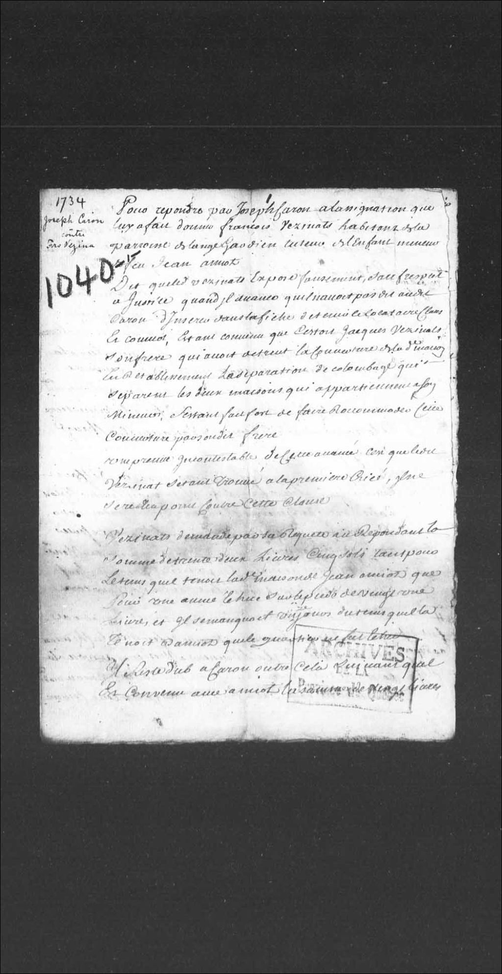 Réponses de Joseph Caron contre François Vézina, habitant de la paroisse de l'Ange-Gardien, tuteur des enfants mineurs de feu Jean Amiot, concernant la destruction de la couverture d'une maison, 12 octobre 1734, Archives nationales à Québec, Collection Pièces judiciaires et notariales, (03Q,TL5,D1040).