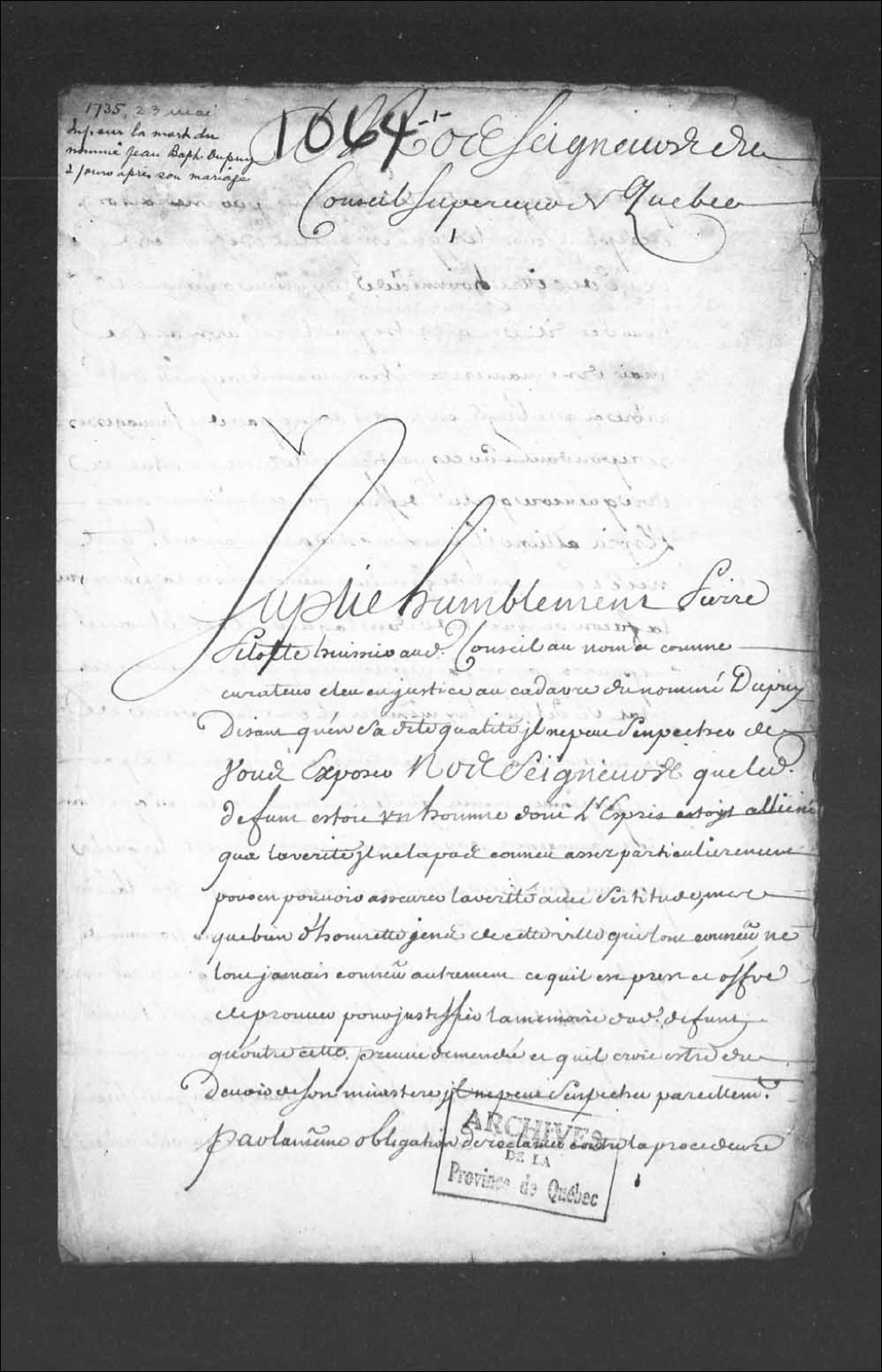 - Ce dossier en matières criminelles provient de la Prévôté de Québec et du Conseil supérieur de Québec. Ce dossier comprend une requête de Pierre Pilote, huissier au Conseil supérieur de Québec, au nom et comme curateur en justice du cadavre du nommé Dupuy; les conclusions du procureur du Roi; la déclaration de la veuve Perthuis; l'addition d'information faite par François Foucault, conseiller au Conseil supérieur de Québec; un recollement