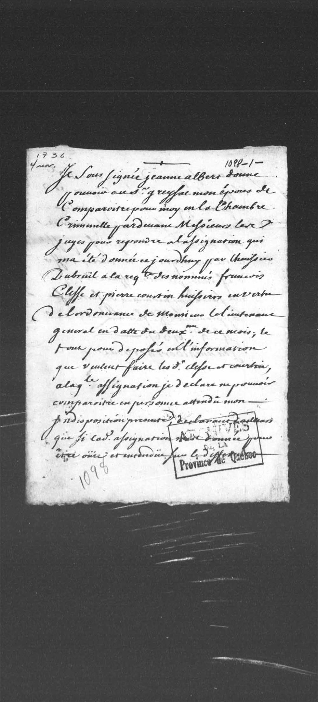 - Ce dossier provient de la Prévôté de Québec et comporte les témoignages ou dépositions des personnes suivantes : François Clesse, 31 ans, premier huissier au Conseil supérieur de Québec, demeurant en la paroisse Notre-Dame; Jean-Baptiste Chaussé dit Lemaine, 48 ans, cordonnier demeurant à Québec, rue Champlain, paroisse Notre-Dame; Pierre Dupras (Duprat), 32 ans, tailleur d'habits demeurant à Québec, rue de la Montagne, paroisse Notre-Dame; Flavie Savary, 36 ans, femme de Jean Labonne dit Léveillé, cabaretier demeurant à Québec, rue Champlain, paroisse Notre-Dame. Ce dossier comprend une note de Jeanne Albert donnant pouvoir à son époux de comparaître à sa place en la chambre criminelle; un procès-verbal de la visite du domicile du sieur Coutret; des informations et répétitions; des exploits d'assignation; les conclusions du procureur du Roi