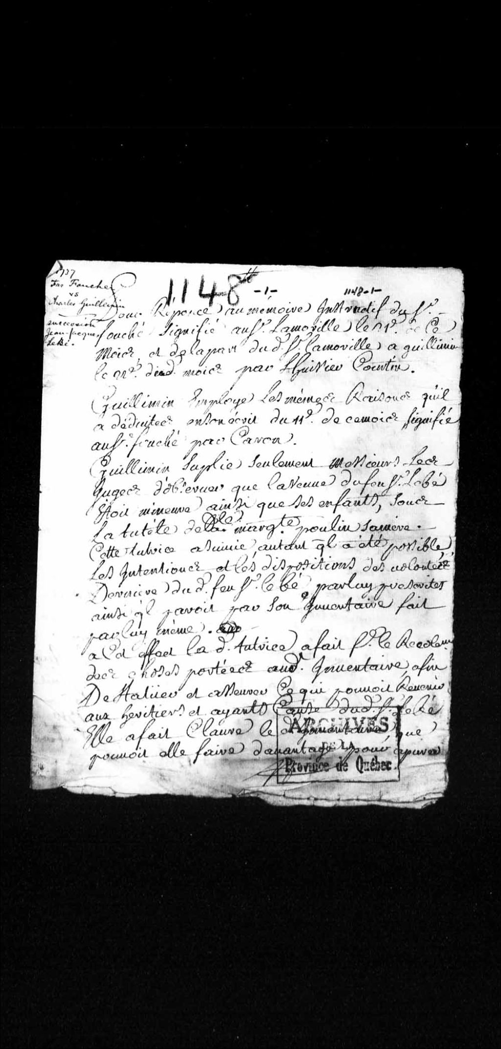 Réponse de Charles Guillimin au mémoire instructif de François Foucher dans le procès relatif à la succession de Jean-Jacques Lebé impliquant François Foucher contre Charles Guillimin, 26 mars 1737, Archives nationales à Québec, Collection Pièces judiciaires et notariales, (03Q,TL5,D1148).