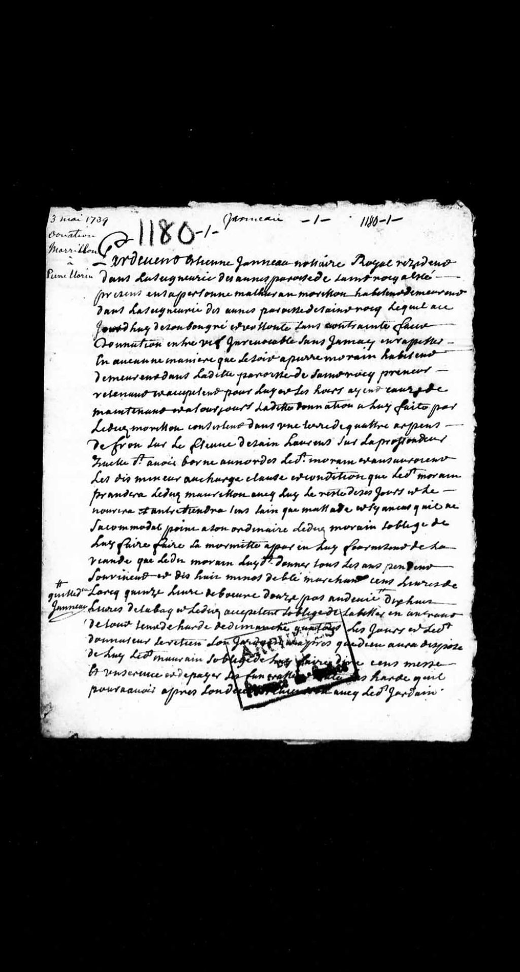 Donation entre vifs par Mathurin Morillon, habitant de la seigneurie de Saint-Roch des Aulnes à Pierre Morin, habitant du même lieu, d'une terre de quatre arpents de front sur le fleuve Saint-Laurent, 3 mai 1739, Archives nationales à Québec, Collection Pièces judiciaires et notariales, (03Q,TL5,D1180).