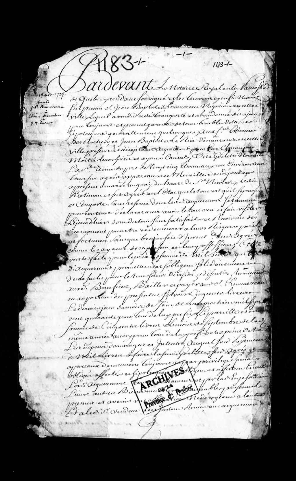 Vente de la goélette «la Sainte-Anne» du port de 25 tonneaux, amarrée au havre de Saint-Nicolas, par Jean-Baptiste Pommereau, négociant à Québec, à Etienne Desrochers et Jean-Baptiste Larue de Québec, 19 novembre 1739, Archives nationales à Québec, Collection Pièces judiciaires et notariales, (03Q,TL5,D1183).