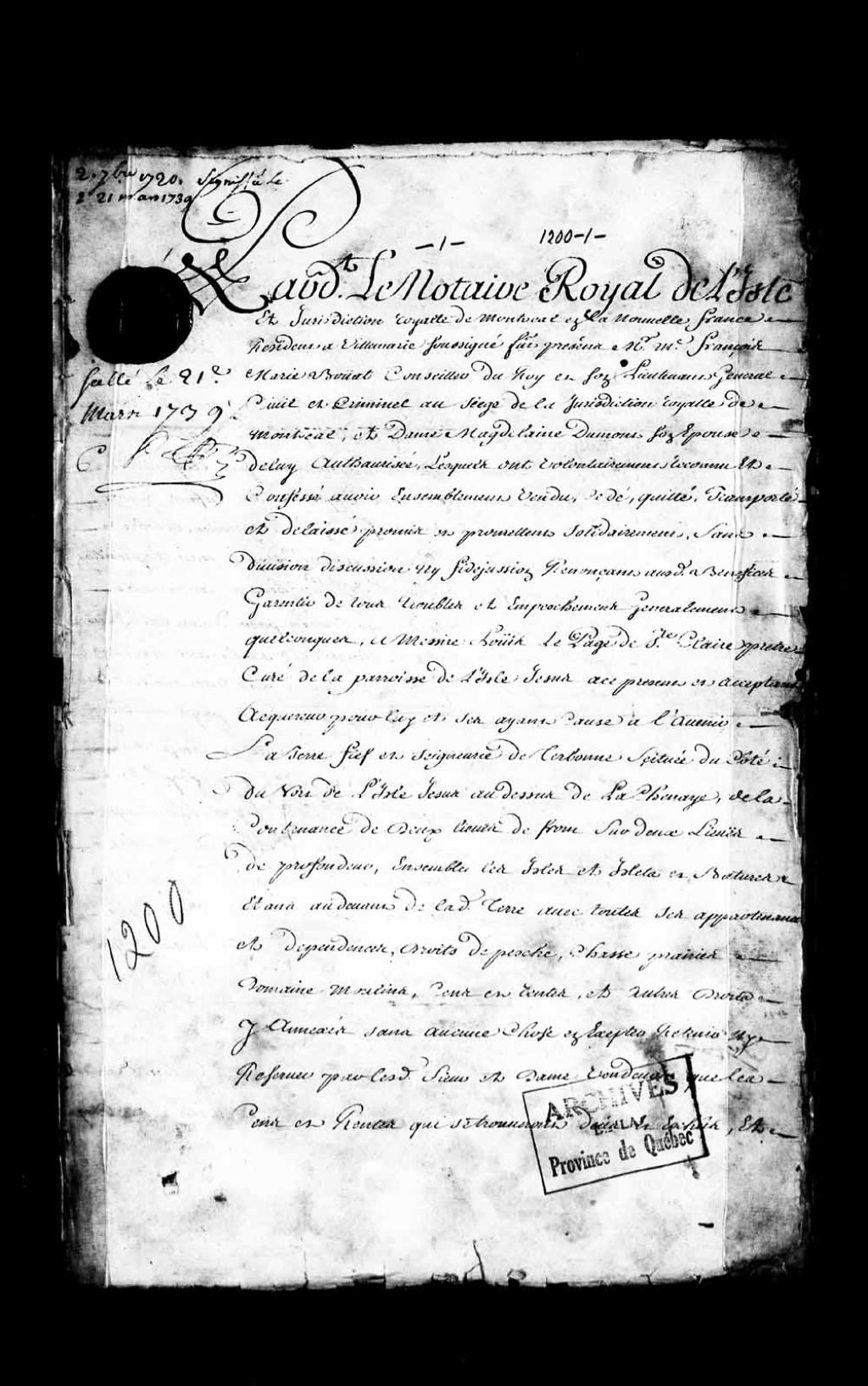 Procès des héritiers de François-Marie Bouat, conseiller du Roi et lieutenant général civil et criminel de la Juridiction royale de Montréal, et de Madeleine Damours, son épouse contre Louis Lepage de Sainte-Claire, prêtre et curé de la paroisse de l'Île-Jésus, concernant la seigneurie de Terrebonne, 2 septembre 1720 au 3 mars 1744, Archives nationales à Québec, Collection Pièces judiciaires et notariales, (03Q,TL5,D1200).