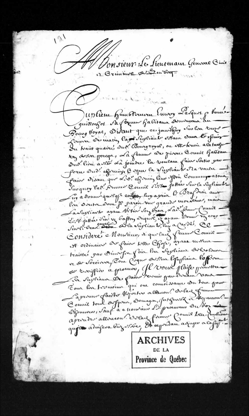 Procédures criminelles contre Geneviève Alexandre, femme de Pierre Conille, demeurant au Bourg-Royal, faite à la requête de Méry (Émery) Paquet, habitant demeurant au Bourg-Royal et Renée Guillocheau, sa femme, pour assaut, 9 juillet 1675 - 23 août 1675, Archives nationales à Québec, Collection Pièces judiciaires et notariales, (03Q,TL5,D121).