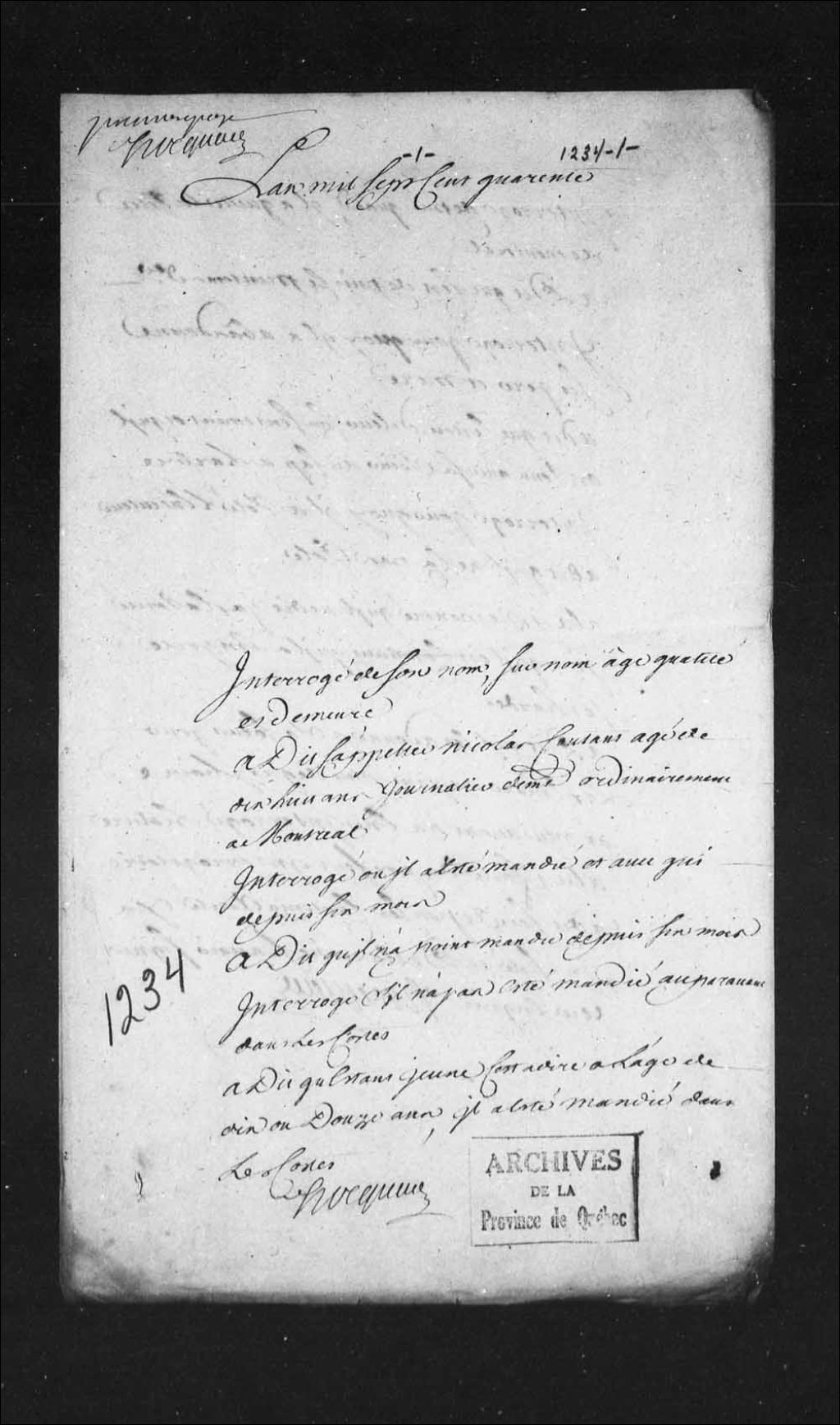 - Ce dossier en matières criminelles provient de la Prévôté de Québec et du Conseil supérieur de Québec et contient les témoignages ou les dépositions des personnes suivantes : Nicolas Coutant dit Lafranchise, âgé de 18 ans, journalier, demeurant à Montréal chez Jacques Coutant, son père; François Mousset, âgé de 22 ans, journalier et vagabond; Élisabeth Coutant, femme d'Antoine Tranchant, âgée de 26 ans, demeurant au Cap à l'arbre (Cap-à-l'arbre) avec son mari. Ce dossier comprend les interrogatoires de Nicolas Coutant dit Lafranchise; les conclusions du procureur du Roi de la Prévôté de Québec; l'écrou de Mousset, Constant et Courteau; les interrogatoires de François Mousset et d'Élisabeth Coutant; le réquisitoire du procureur du Roi; la sentence de la Prévôté de Québec; la confirmation du jugement de la Prévôté par le Conseil supérieur de Québec