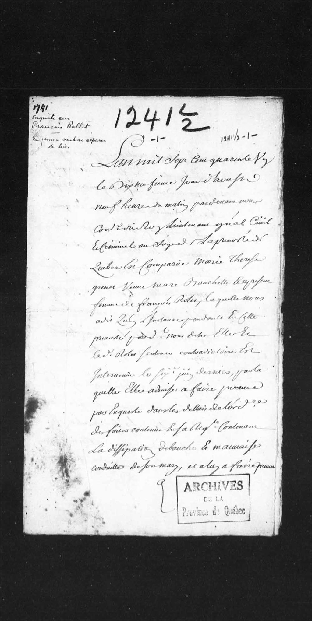 - Enquête à propos de la séparation de corps entre François Rolet (Rollet) et Marie-Thérèse Grenet, auparavant veuve de Marc Bouchet (Bouchette), à la requête de cette dernière, vu la débauche et la mauvaise conduite de son mari