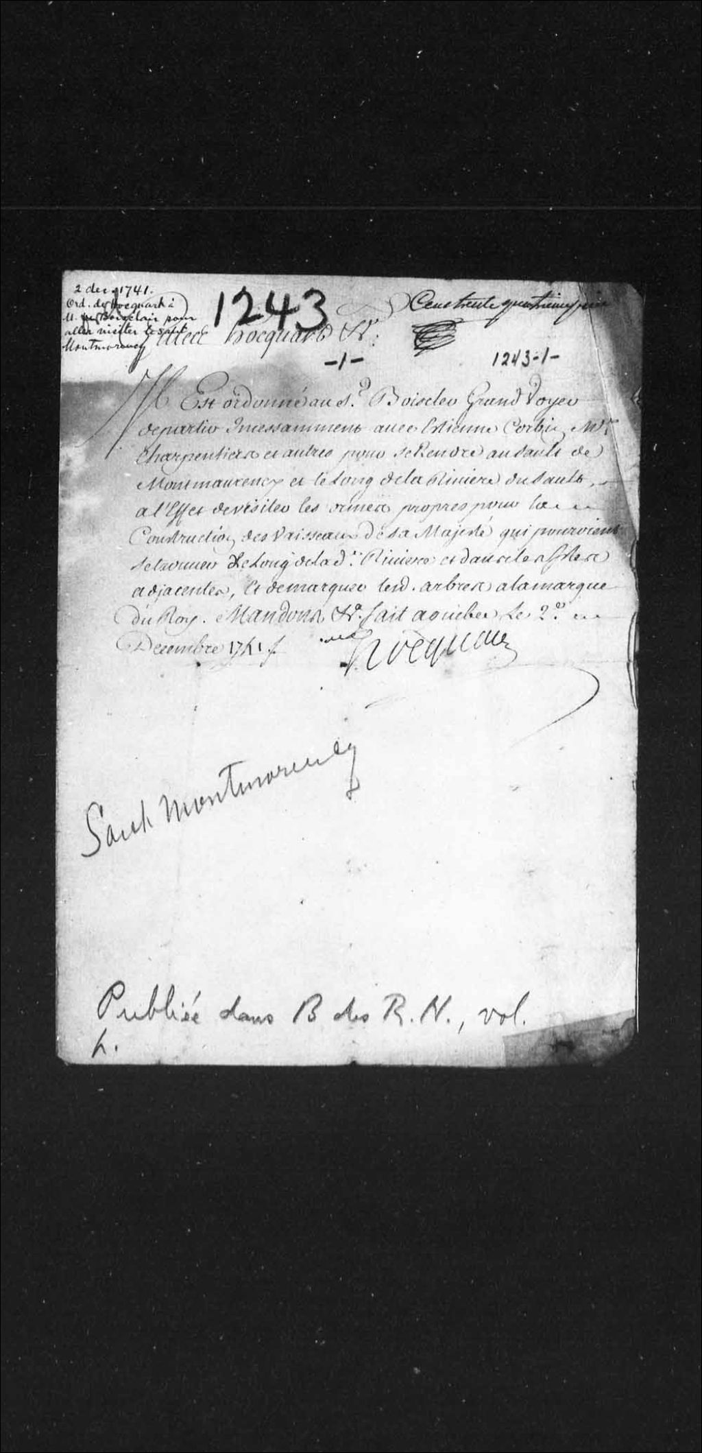 Ordonnance de l'intendant Gilles Hocquart à Boisclerc de Lanoullier (Lanouiller - Lanouillier), grand voyer de partir en compagnie d'Étienne Corbin, maître charpentier et autre, pour le Sault Montmorency et la rivière du Sault, afin de visiter les ormes (bois) pour la construction des vaisseaux (navires) du Roi