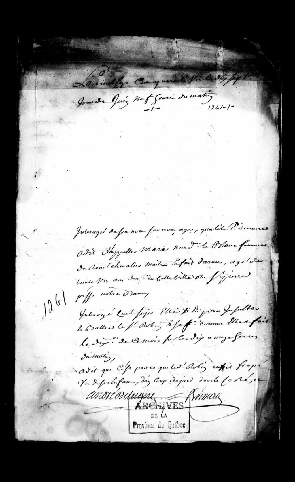 - Ce dossier en matières criminelles provient de la Prévôté de Québec et contient les témoignages ou les dépositions des personnes suivantes : Marie-Madeleine Leblanc, femme de René Chevalier, maître en fait d'armes, âgée de 31 ans, demeurant à Québec, rue Saint-Pierre, paroisse Notre-Dame; Henri Breton (LeBreton), navigateur, demeurant à Québec, rue Saint-Pierre, paroisse Notre-Dame, âgé de 33 ans; Barthélémy Rose (Rosa) dit Nolin, demeurant chez Barthélémy Rose, son père, rue du Sault-aux-Matelots, paroisse de Notre-Dame, âgé de 20 ans; Isidore Morin, navigateur demeurant à Québec, rue Saint-Pierre, paroisse Notre-Dame, âgé de 25 ans; Marie Dumesnil (Dumesny - Dumenil), femme de Jean Lespagnol, journalier de Québec, demeurant rue Saint-Pierre, paroisse Notre-Dame, âgée de 36 ans. Ce dossier comprend l'interrogatoire de Marie-Madeleine Leblanc; une information faite par la Prévôté de Québec; une ordonnance de la Prévôté de Québec, afin de procéder à l'interrogatoire de Leblanc; le certificat du chirurgien Desnouhes; un procès-verbal d'assignation des témoins; l'ordonnance d'assignation des témoins; la requête de Jean Robin, adressée à la Prévôté de Québec